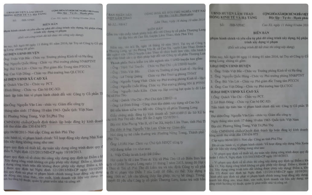 Trước đó, vào tháng 7/2015, Hạt Quản lý đê điều Lâm Thao và TX Phú Thọ cũng đã 3 lần tổ chức kiểm tra và lập biên bản về hành vi vi phạm của Công ty Thượng Long, nội dung các biên bản này đều ghi rõ: Tại Km 94+400 tuyến đê Tả Thao thuộc xã Cao Xá, Công ty Thượng Long đã vi phạm khoản 5, Điều 7 của Luật Đê điều: Xây dựng móng và cột nhà xưởng sản xuất gạch không nung ngoài bãi sông khi chưa có giấy phép của các cấp thẩm quyền. Cơ quan này cũng yêu cầu đình chỉ ngay vi phạm trên của Công ty Thượng Long, tạm dừng việc lắp dựng cột nhà xưởng và tháo dỡ những cột đã hoàn thành, tháo dỡ toàn bộ phần móng đã xây dựng, hoàn trả lại mặt bằng bãi sông nhằm đảm bảo hành lang bảo vệ đê, kè.