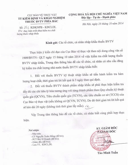 Đó Công văn số 151/KĐKNPB-KĐCLDL quy định thời gian thực hiện triển khai kiểm tra chất lượng thuốc bảo vệ thực vật (BVTV) nhập khẩu. Theo nội dung quy định tại văn bản, đối với thuốc BVTV kỹ thuật nhập khẩu sẽ tiến hành kiểm tra hàm lượng hoạt chất với thời gian trả kết quả là 3 ngày làm việc. Đối với thuốc BVTV thành phẩm nhập khẩu, sẽ phải kiểm tra đầy đủ các chỉ tiêu lý hóa và thời gian trả kết quả là 20 ngày, không kể thời gian lấy mẫu.