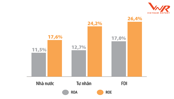Hiệu quả sử dụng vốn của các DN FDI cũng vượt trội, với ROE của khối này là 26,4% so với mức 17,6% của khối DNNN. Sự chênh lệch nhiều về khả năng sinh lời cho thấy năng lực cạnh tranh của các DN trong nước, mặc dù có cải thiện trong vài năm qua nhưng vẫn còn ở mức thấp và nếu không cải thiện sẽ bị tụt hậu so với các DN FDI năng động và hiệu quả.