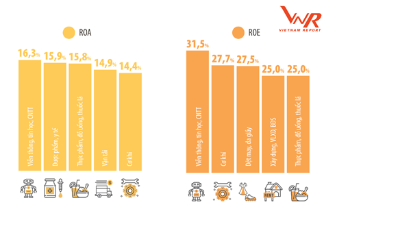 Xét theo ngành, những ngành có ROA cao nhất so với mức bình quân chung là các ngành Viễn Thông – Công nghệ Thông tin; Dược phẩm – Y tế; Thực phẩm – Đồ uống; Vận tải…Những ngành có ROE cao nhất so với mức bình quân chung trong Bảng xếp hạng Profit 2019 là các ngành Viễn Thông – Công nghệ Thông tin; Cơ khí; Dệt may – Da Giày; Xây dựng – Bất động sản; Thực phẩm – Đồ uống…