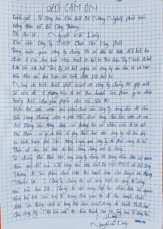 "Hiện, vườn chuối của Công ty đang đến độ chín, có khoảng 1.500 - 2.000 tấn đang chín rộ trong vườn, do các chốt không lưu thông, phương tiện vận chuyển, nhân công không thể qua chốt để thu hoạch, vận chuyển chuối, việc đi lại khó khăn, nếu không giải quyết kịp công ty sẽ đứng trước nguy cơ phá sản" - trong thư ông Dũng viết.