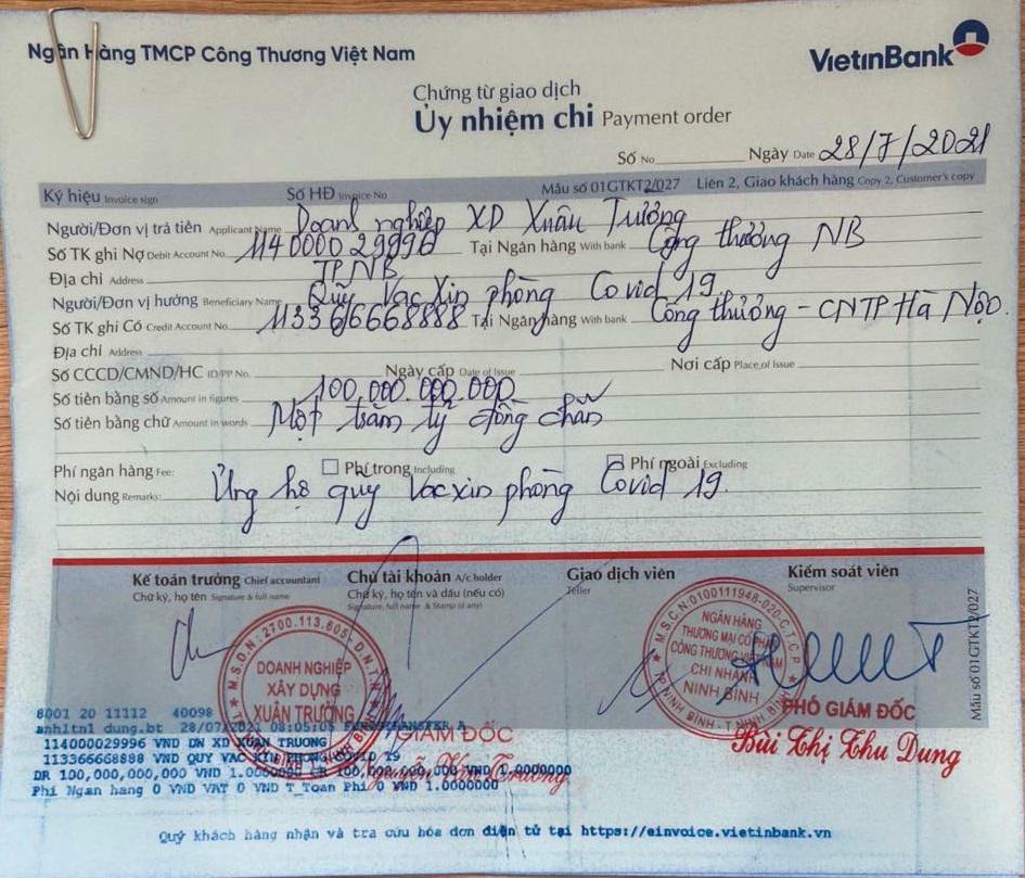 Nhằm chung tay cùng Nhà nước và nhân dân đẩy lùi dịch bệnh COVID-19, Doanh nghiệp Xây dựng Xuân Trường đã chuyển số tiền nói trên thông qua Ngân hàng Thương mại Cổ phần Công thương Việt Nam chi nhánh Ninh Bình.