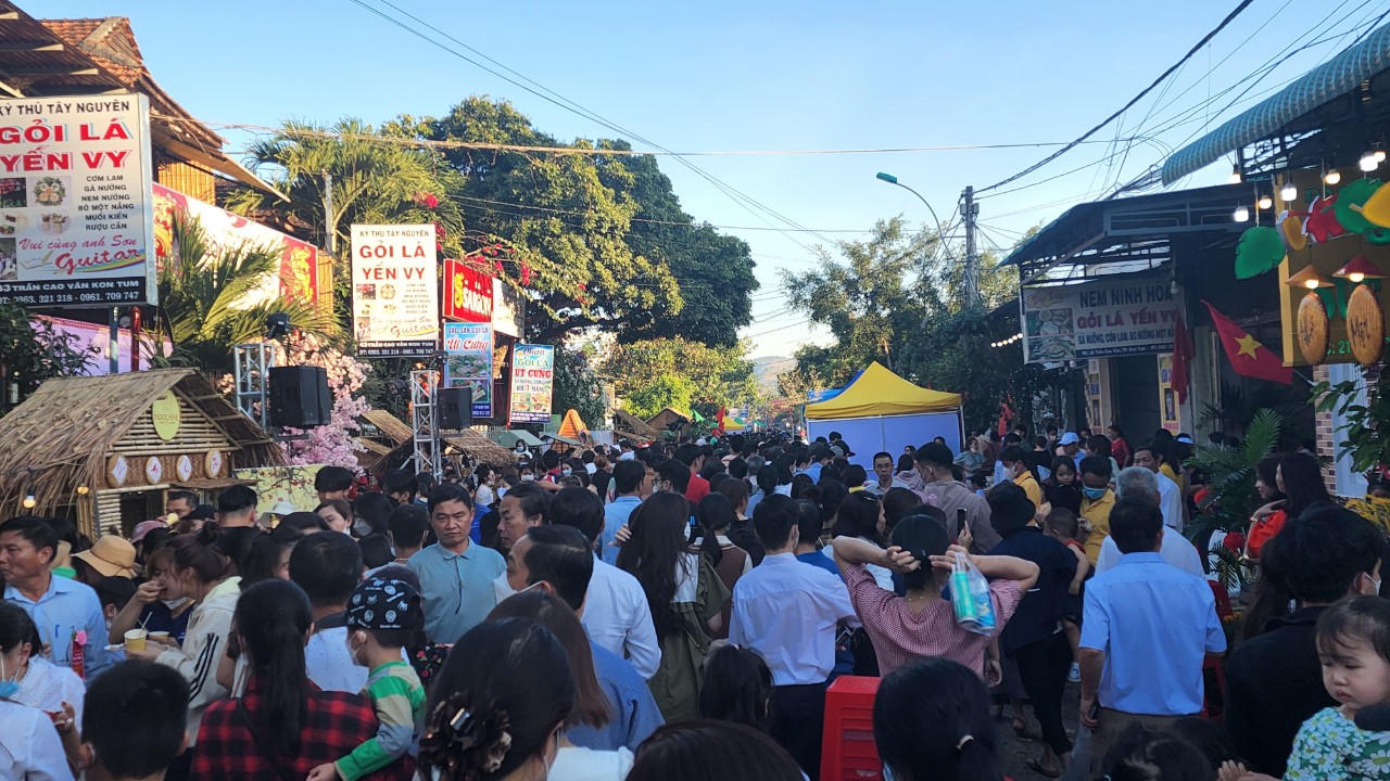 | Đông du khách, người dân địa phương thăm quan và thưởng thức những món ăn tại Liên hoan ẩm thực thành phố Kon Tum. |