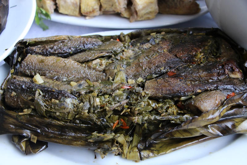 Món cá suối nướng cuộn lá chuối.