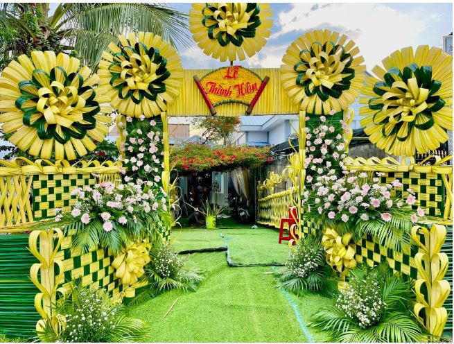 Cổng cưới lá dứa - đặc trưng miền Tây theo phong cách hiện đại. |