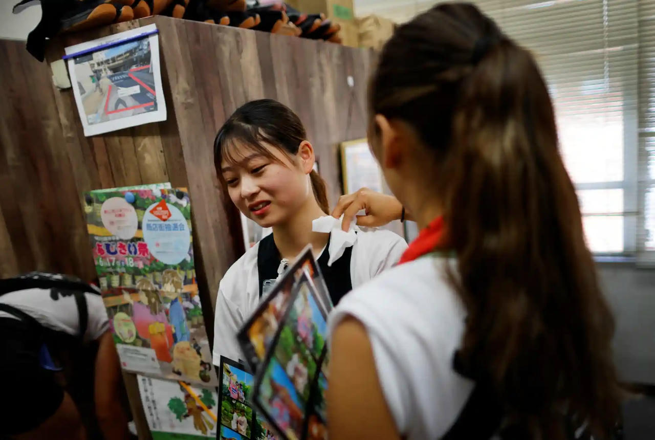 Shiori Yoshida (28 tuổi) giúp đồng nghiệp mới Riho Arai (19 tuổi), chuẩn bị đi làm tại văn phòng của họ ở quận Asakusa tại Tokyo. Ảnh: Reuters.