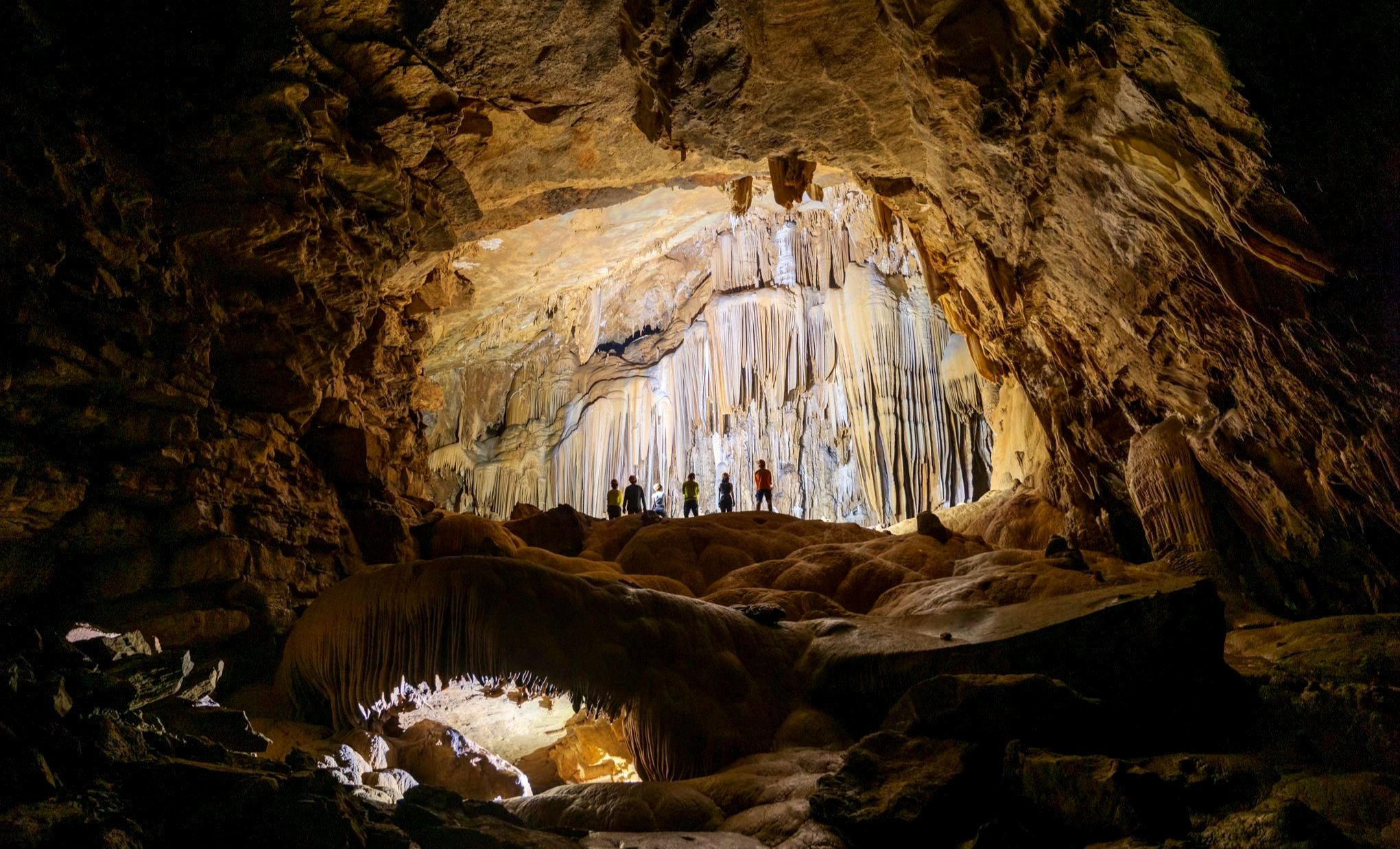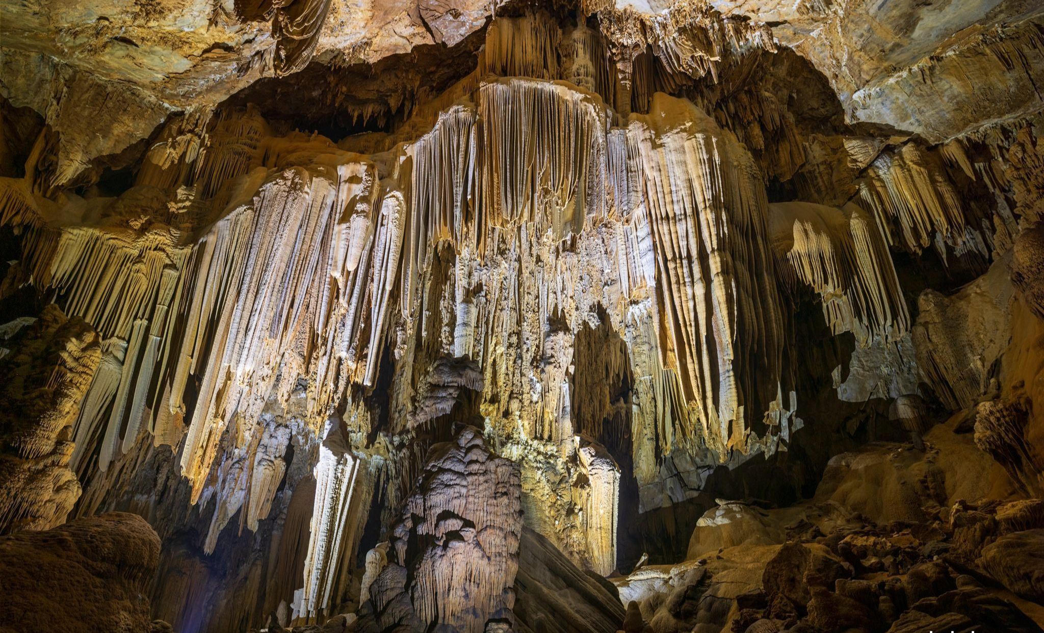 Hệ thống thạch nhũ như những bức màn rèm khổng lồ ở Hung Thoòng. Ảnh: Nguyên Vân |