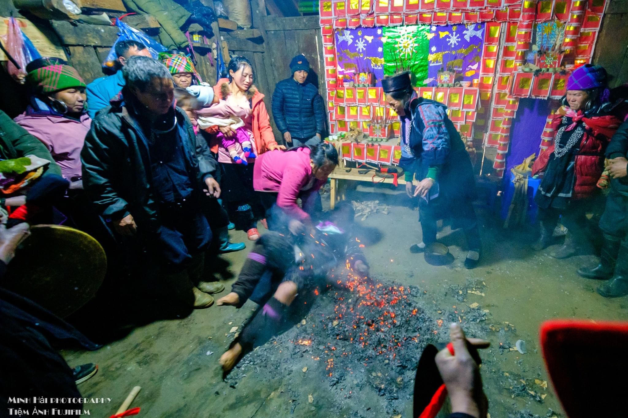 Thầy cúng lăn qua lăn lại đóng than để làm phép |