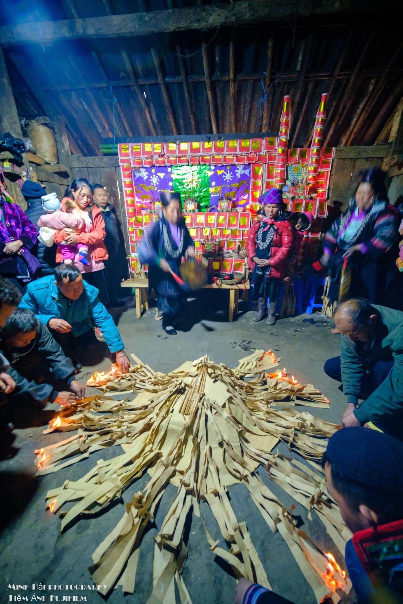 Người nhà bắt đầu châm lửa, thầy cúng và nữ chủ nhà vừa đánh chiêng vừa nhảy |