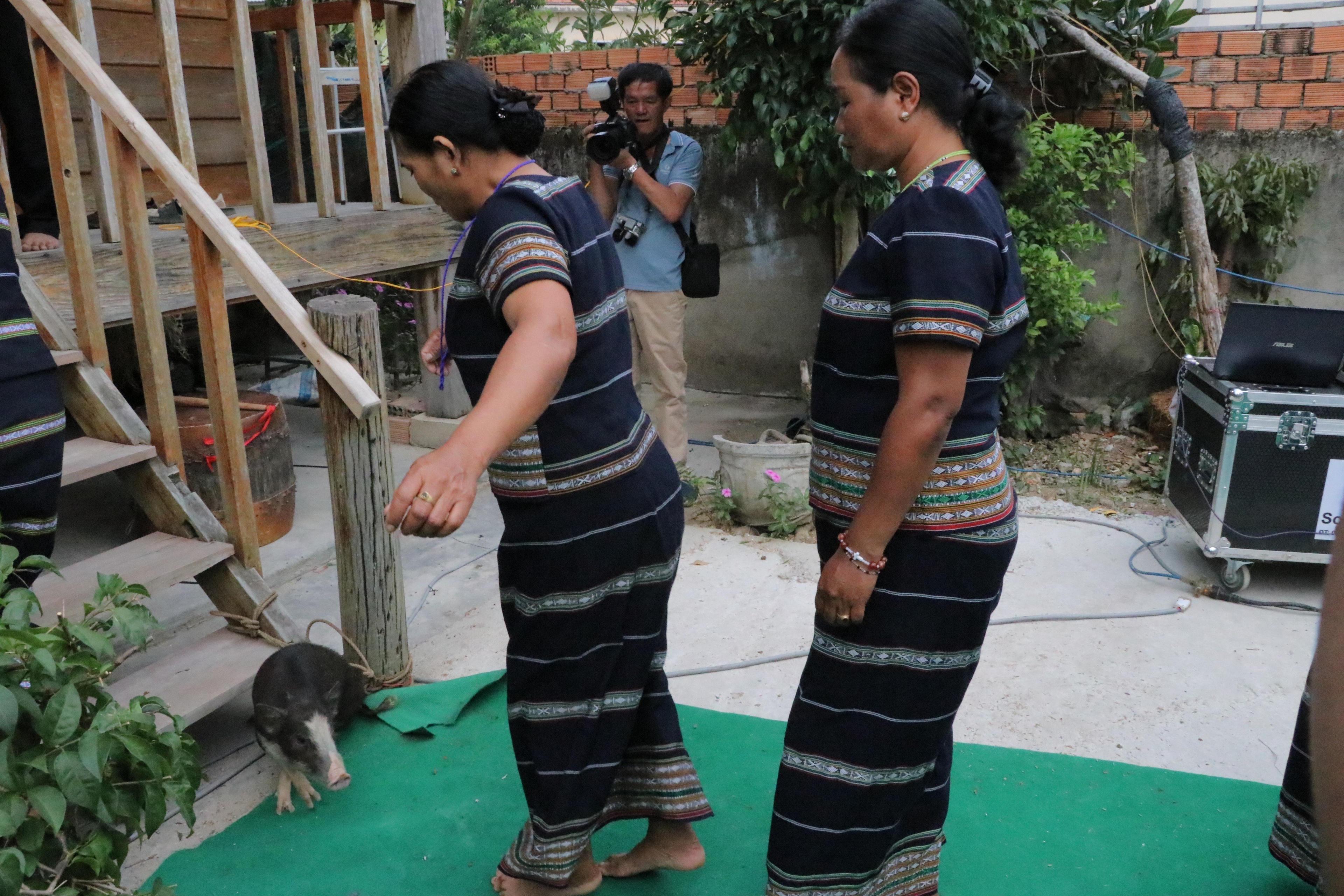 | Trước khi vào nhà gái, mọi người trong đoàn nhà trai đá vào con heo buộc ở chân cầu thang, con heo này gọi là héo đá, heo đụng. |