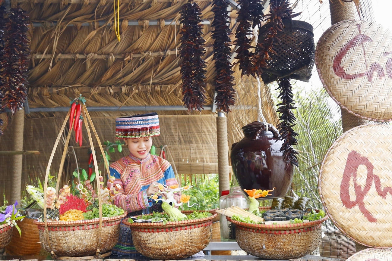 Cuộc vui càng thêm hứng khởi với hành trình khám phá các gian hàng ẩm thực vùng cao trong khuôn viên rộng tới 6.000 mét vuông. Thịt lợn cắp nách nướng lá mắc mật, thịt trâu gác bếp thơm mùi mắc khén,… cùng hàng trăm món ăn chế biến cầu kỳ từ nhiều loại gia vị, rau củ miền sơn cước như lời mời gọi khám phá thế giới ẩm thực Tây Bắc quyến rũ. Du khách có thể mua quà là những sản vật được đồng bào dân tộc bày bán dọc tuyến đường trung tâm khu du lịch.