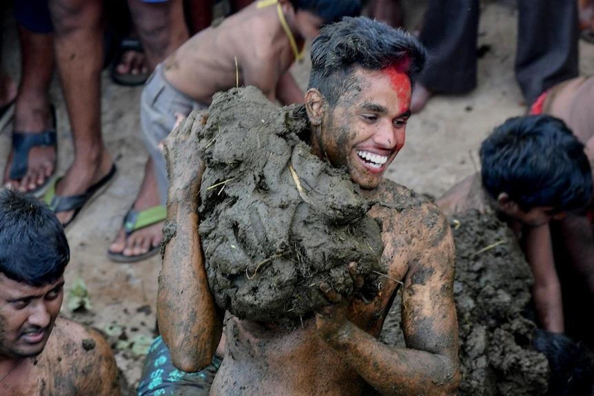 Những người đàn ông ném phân bò vào nhau trong lễ hội Gorehabba hàng năm, đánh dấu sự kết thúc của lễ hội Hindu Diwali. Ảnh: AFP