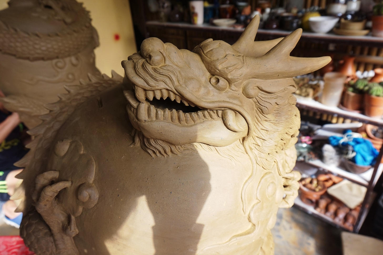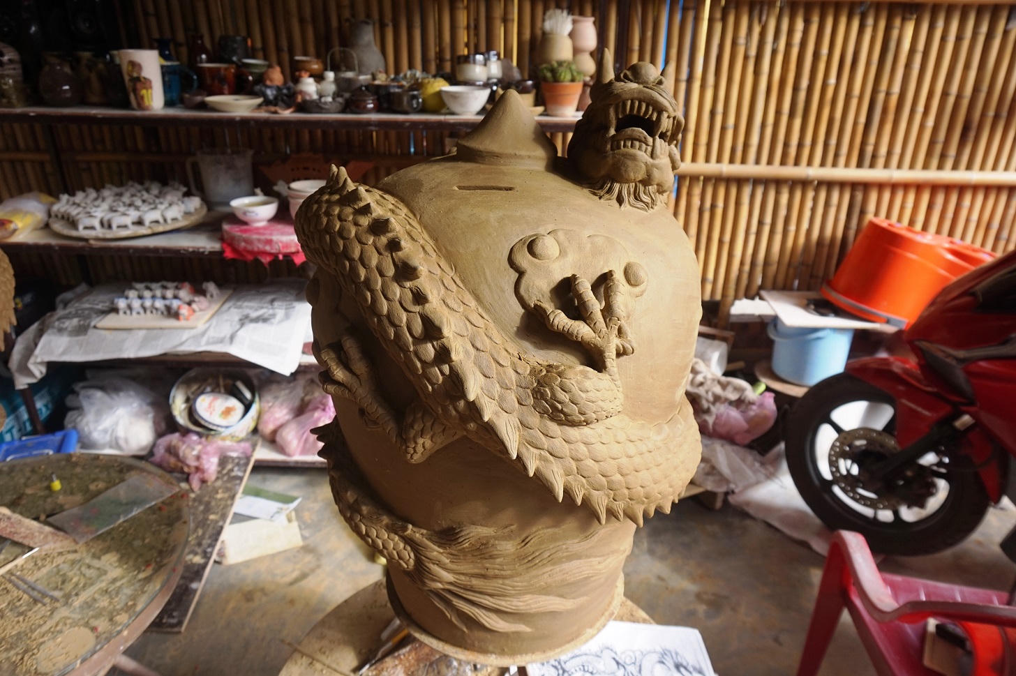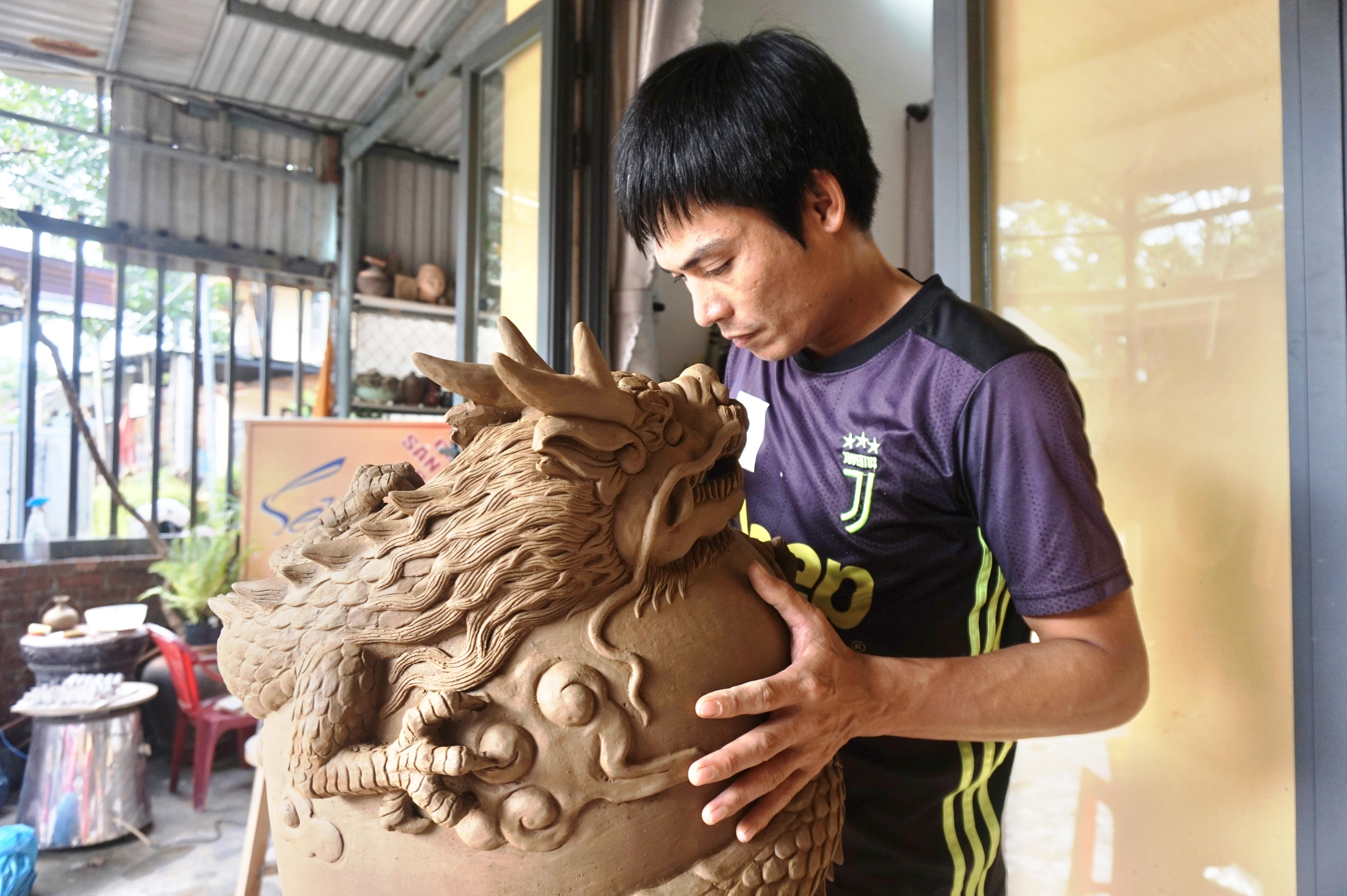 Còn hơn 20 ngày nữa là tới Tết Nguyên đán, tại xưởng gốm Lê Văn Nhật (làng gốm Thanh Hà), các nghệ nhân đang hăng say làm việc với các công đoạn tạo hình, tỉ mỉ từng chi tiết để tạo nên những sản phẩm rồng phục vụ thị trường tết Giáp Thìn 2024.