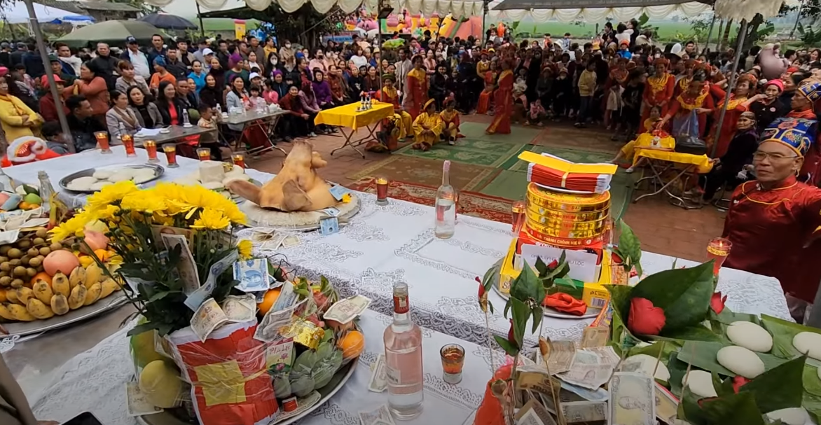 Người dân chuẩn bị chu đáo các phần lễ để dâng lên Thành hoàng làng. |
