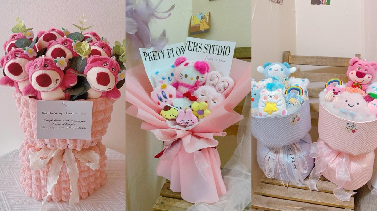 Không chỉ hoa len, gấu bông cũng hút khách không kém vào dịp lễ năm nay. Món quà này trở nên sáng tạo hơn vì được tạo hình thành những bó hoa vô cùng dễ thương, 'không đụng hàng'. Giá hoa gấu bông dao động từ 150.000 trở lên tùy vào kích thước vào kiểu dáng của bó hoa.