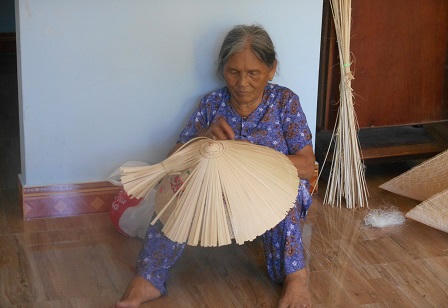 61 tuổi, bà Mai Thị Thu (ngụ khu vực Vạn Thuận, phường Nhơn Thành) vẫn thoăn thoắt đưa đường kim chằm nón. Bà bảo nghề làm nón có từ lâu lắm rồi, hồi mẹ của bà đã biết làm ra chiếc nón. Một ngày, mỗi người làm khoảng 8 đến 9 chiếc nón, trừ hết tiền vốn còn được 50.000 đồng.