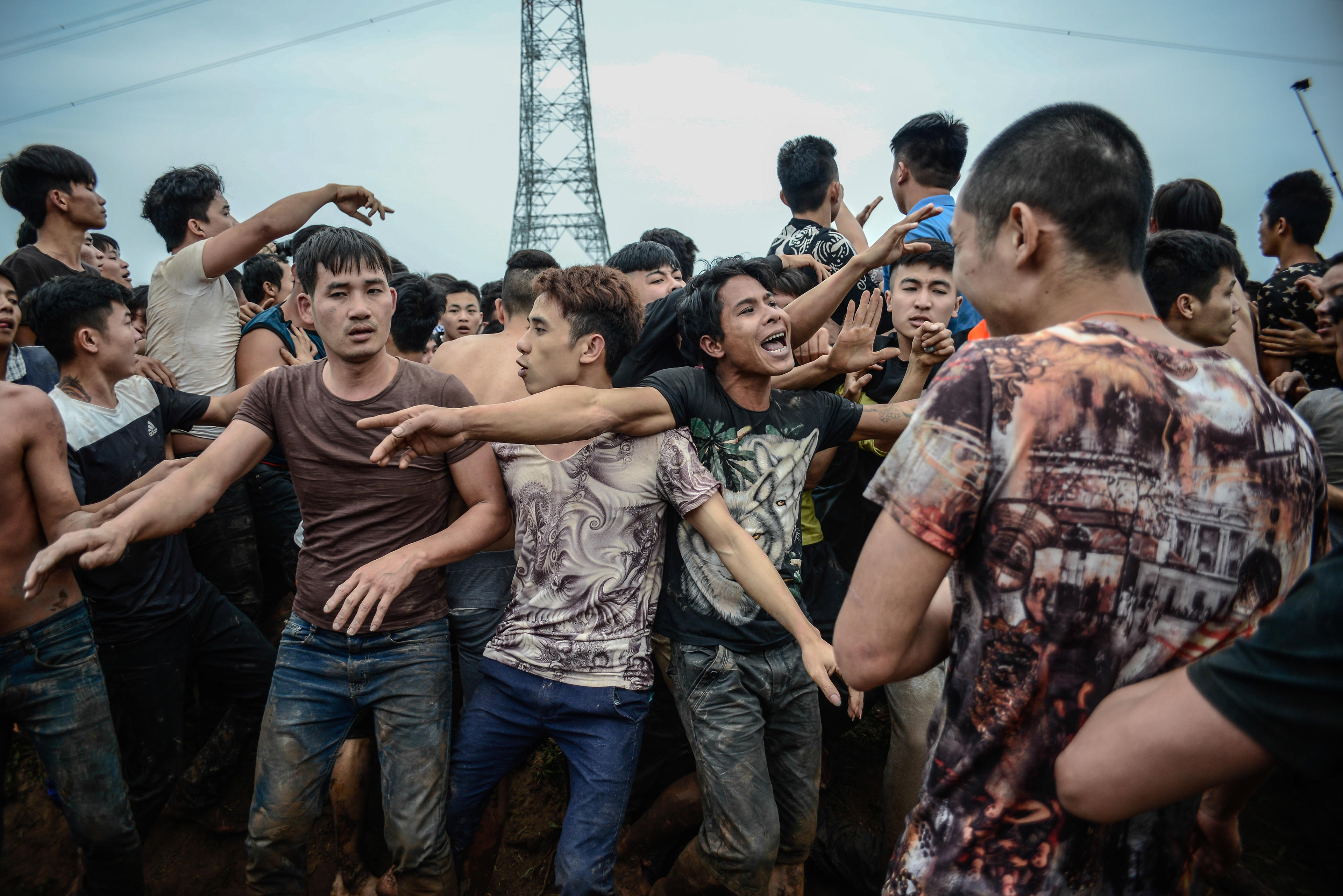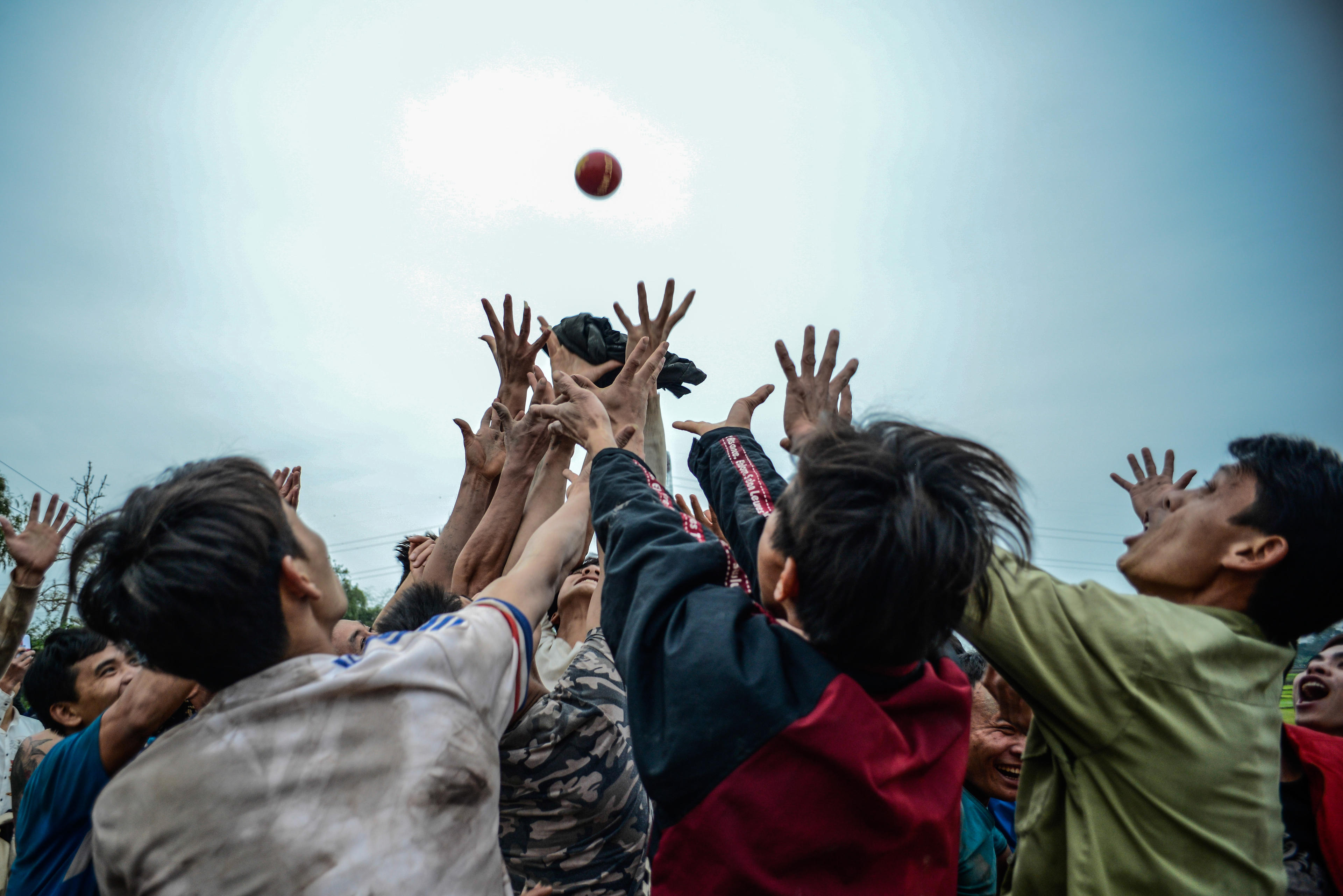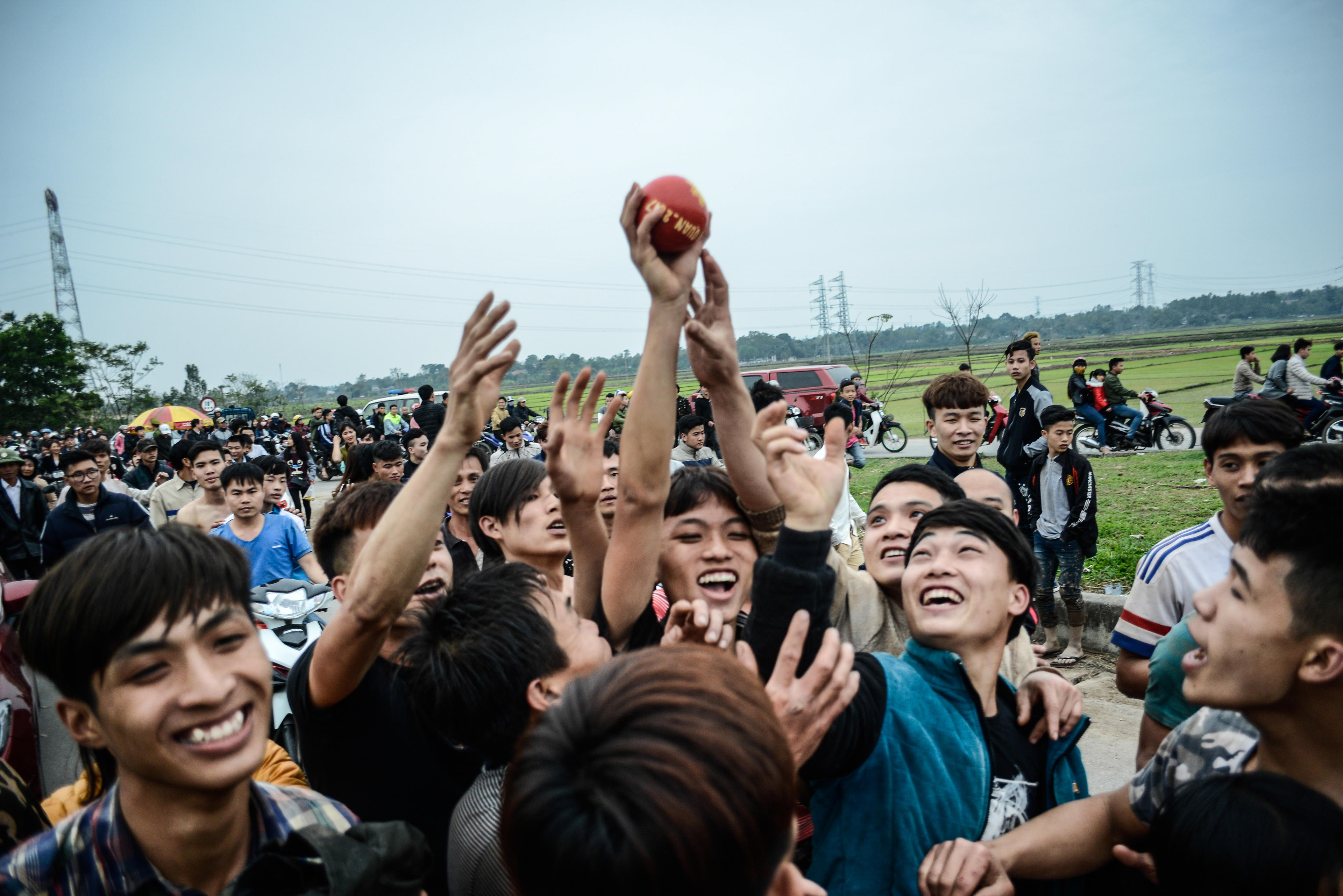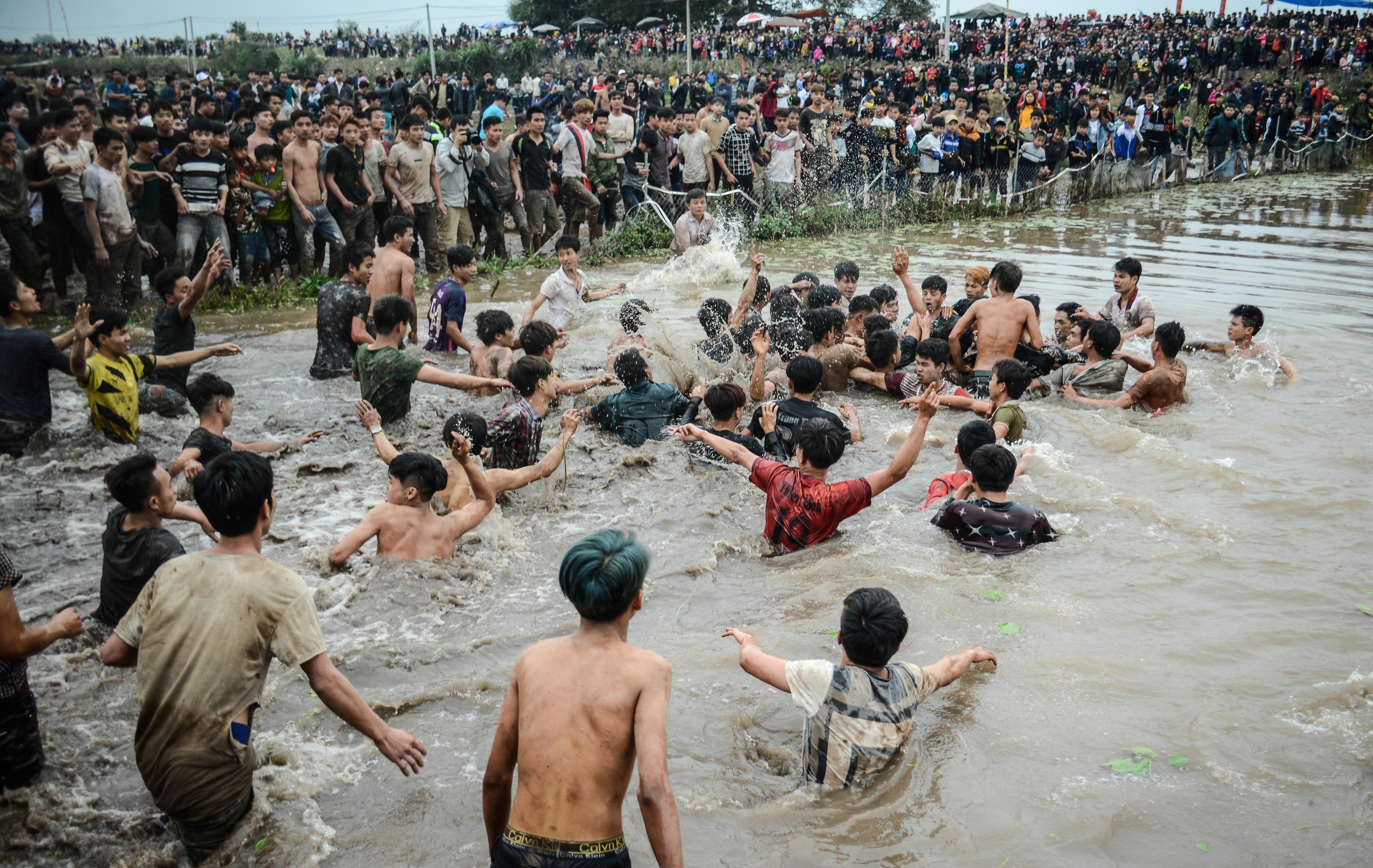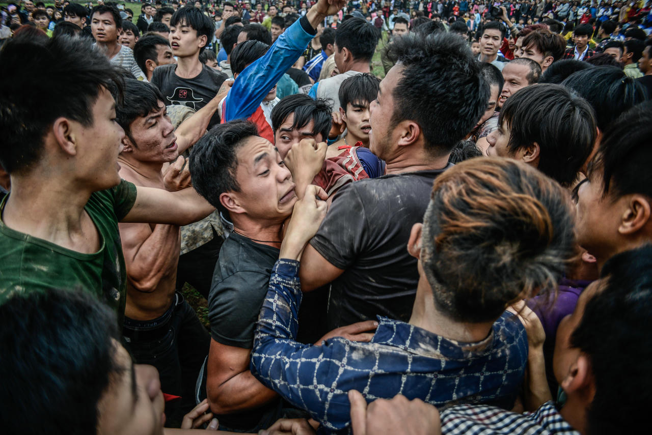 Gần chục bàn tay cố gắng chạm quả phết. Họ tin rằng chỉ cần chạm tay vào quả phết là có thể lấy may, còn nếu cướp được quả phết, quả chúi thì cả gia đình và thôn xóm sẽ may mắn cả năm.