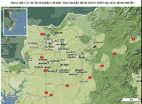 Theo một nghiên cứu gần đây nhất, Thạc sĩ Kiên cho biết tỉnh Bình Phước phổ biến các di tích đất đắp dạng tròn, ở 35 địa điểm trên địa bàn toàn tỉnh. Các di tích này có đường kính phổ biến trên 200m, cá biệt, một số Thành có đường kính trên 300m. Đây là các di tích cư trú - phòng thủ của cư dân cổ, niên đại khoảng hơn 3 ngàn năm trước.
