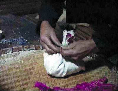 Khi đi đến gần nhà cô dâu, thầy Ta đem đến một tấm khăn hồng, phủ lên mình cô dâu đang ở trên lưng người anh trai. Hai tay cô dâu bắt chéo quanh cổ, một tay cầm túi tiền đi đường, anh trai chống gậy chờ lệnh khởi hành để thực hiện nghi thức cõng em gái ra cổng. Khi cõng em gái đến đoàn nhà trai đang đợi sẵn trước cổng, anh trai của cô dâu để thầy Ta làm lễ cởi bỏ khăn.