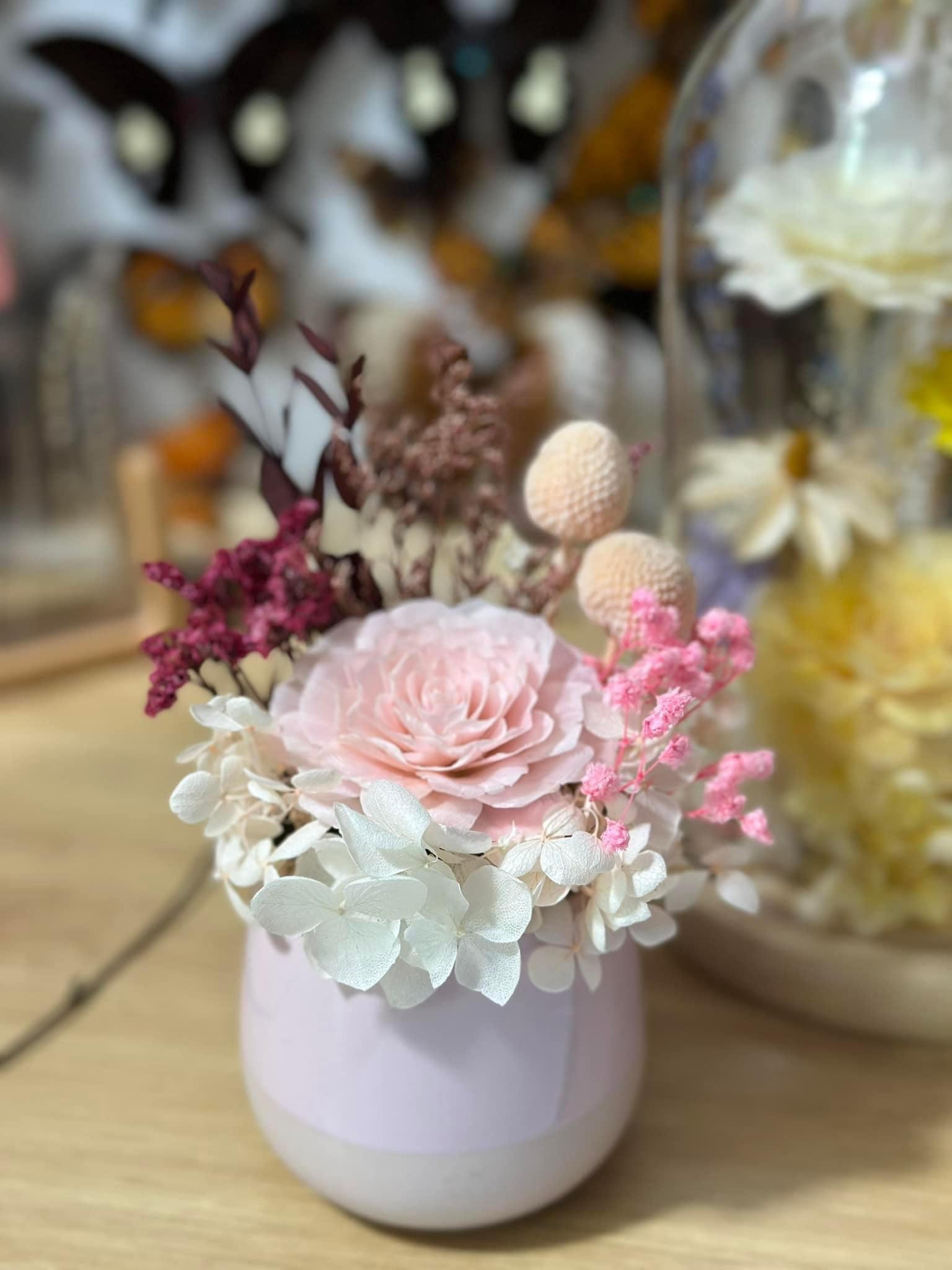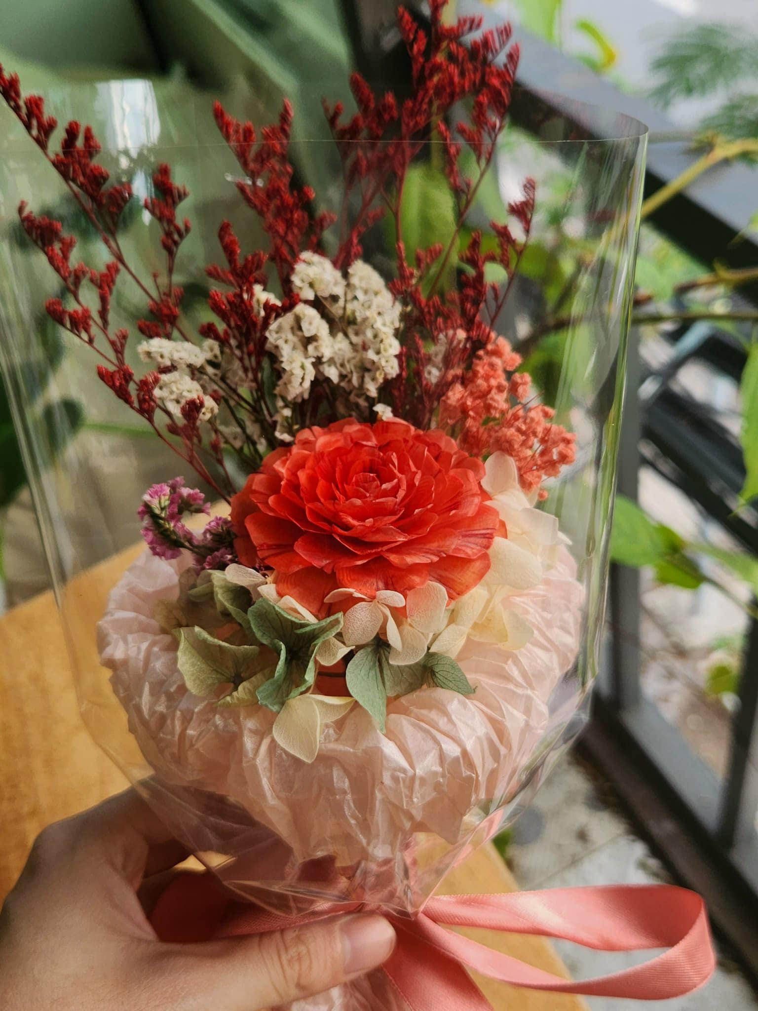 Mỗi cánh hoa đều xếp từ vảy cá tạo hiệu ứng cánh hoa cong - cụp rất riêng mà không có loài hoa khô nào trên thị trường có được. |