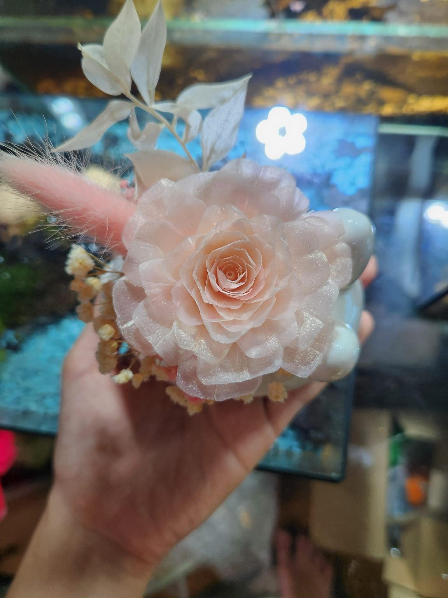 Bên cạnh vảy cá là nguyên liệu chủ đạo, còn cần các vật dụng phụ kiện trang trí đi kèm như hoa khô, con bướm, lá cây… cho cành hoa sinh động.