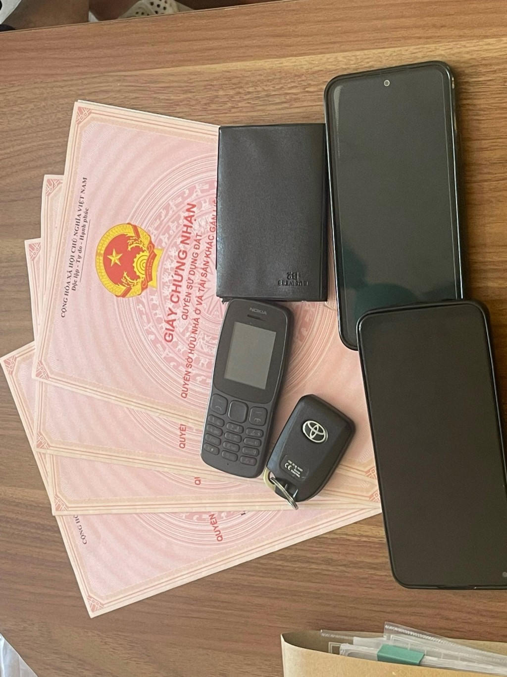 Khám xét nơi ở của Vọng và Thủy, lực lượng Công an thu giữ hơn 256 triệu đồng, 1 xe ô tô, 2 điện thoại di động, 4 giấy chứng nhận quyền sử dụng đất cùng nhiều giấy tờ, sổ sách liên quan đến hành vi cho vay lãi nặng.
