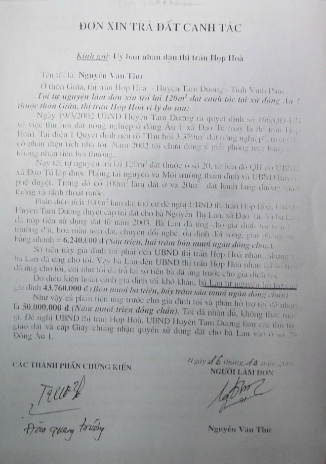 Một số “chứng cứ” trong phiên tòa mới đây cho rằng khi đó hai bên thỏa thuận bà này hỗ trợ cha anh Thái 50 triệu đồng. Cha anh Thái bị cho là đồng ý và có đơn xin trả lại 120m2 đất canh tác “dưới sự chứng kiến của cán bộ địa chính xã”.