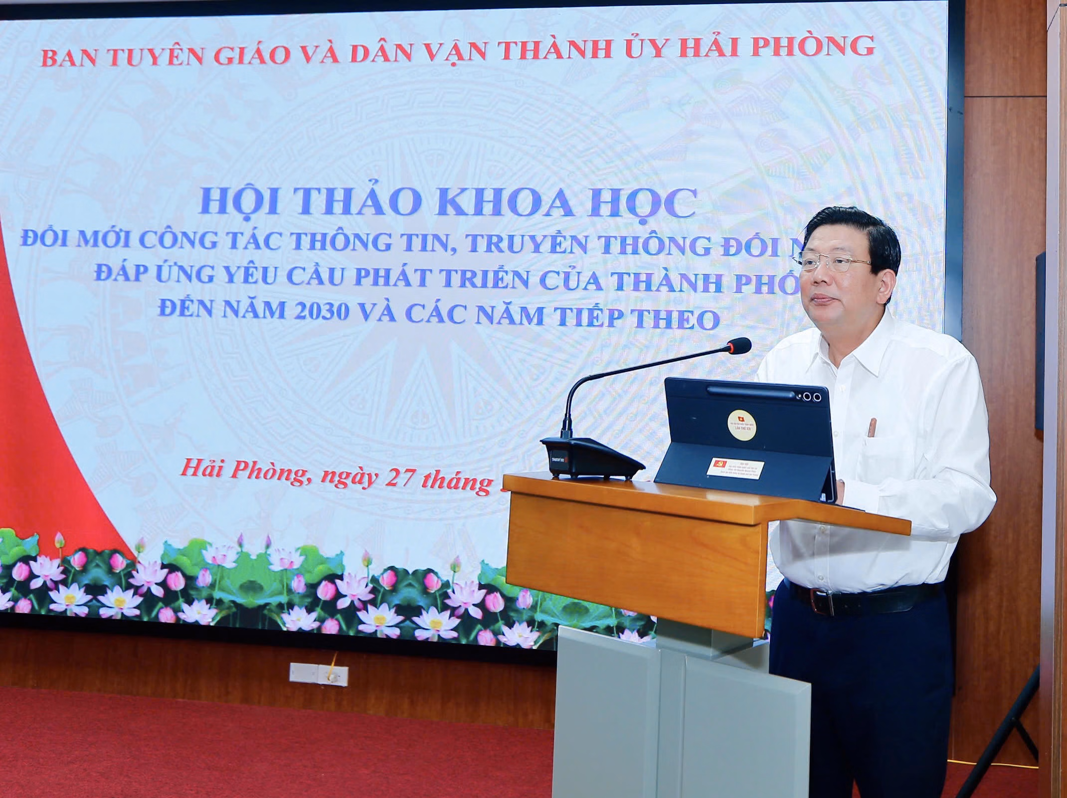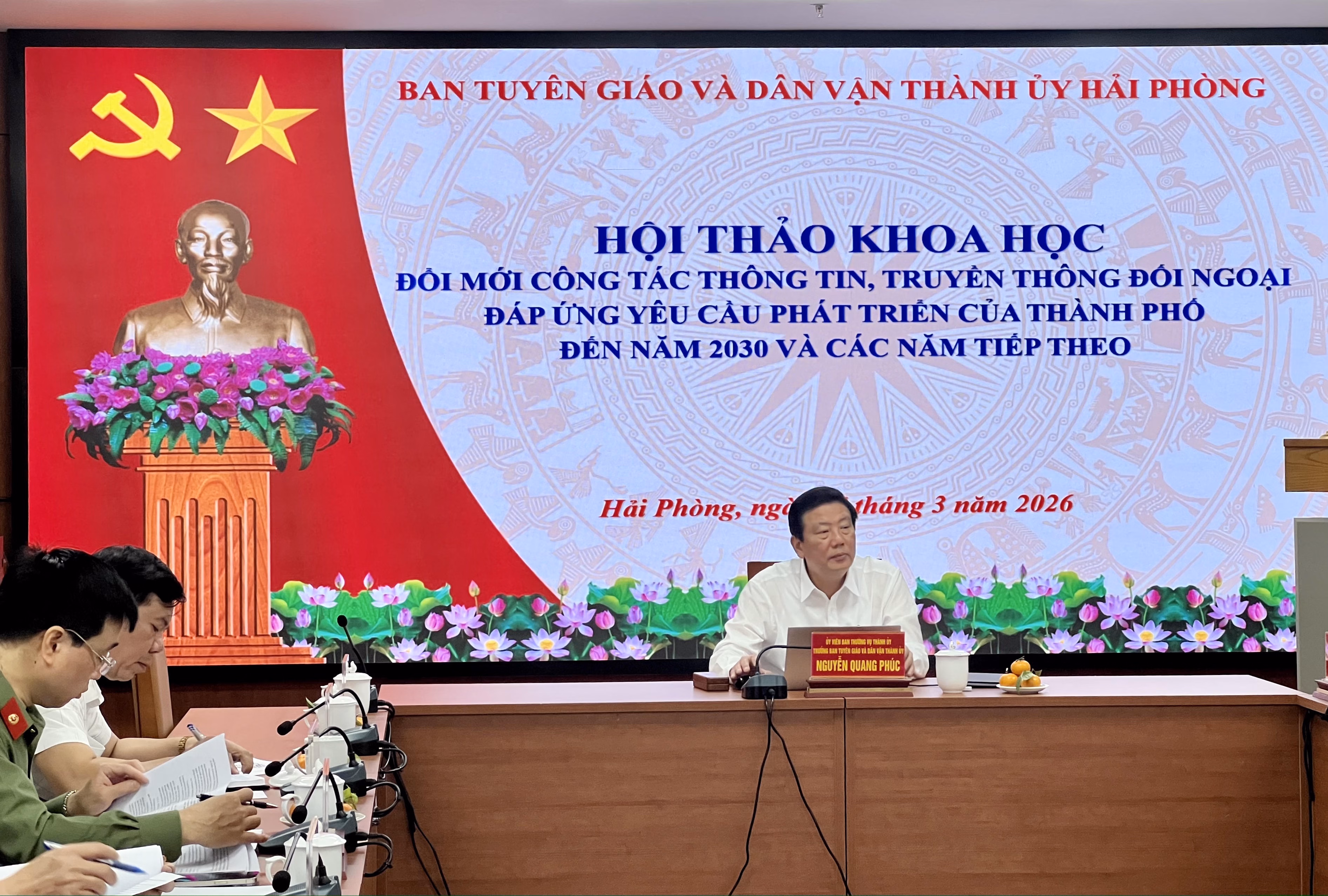 Phát biểu đề dẫn hội thảo, Trưởng Ban Tuyên giáo và Dân vận Thành ủy Hải Phòng Nguyễn Quang Phúc nhấn mạnh: Với vai trò là trung tâm kinh tế biển, cửa ngõ giao thương quốc tế của khu vực phía Bắc, Hải Phòng đang vươn lên trở thành đô thị cảng hiện đại, hội nhập sâu rộng. Trong bối cảnh đó, việc đổi mới mạnh mẽ công tác thông tin, truyền thông đối ngoại không chỉ là yêu cầu cấp thiết mà còn là giải pháp quan trọng để nâng cao vị thế và sức cạnh tranh của TP.