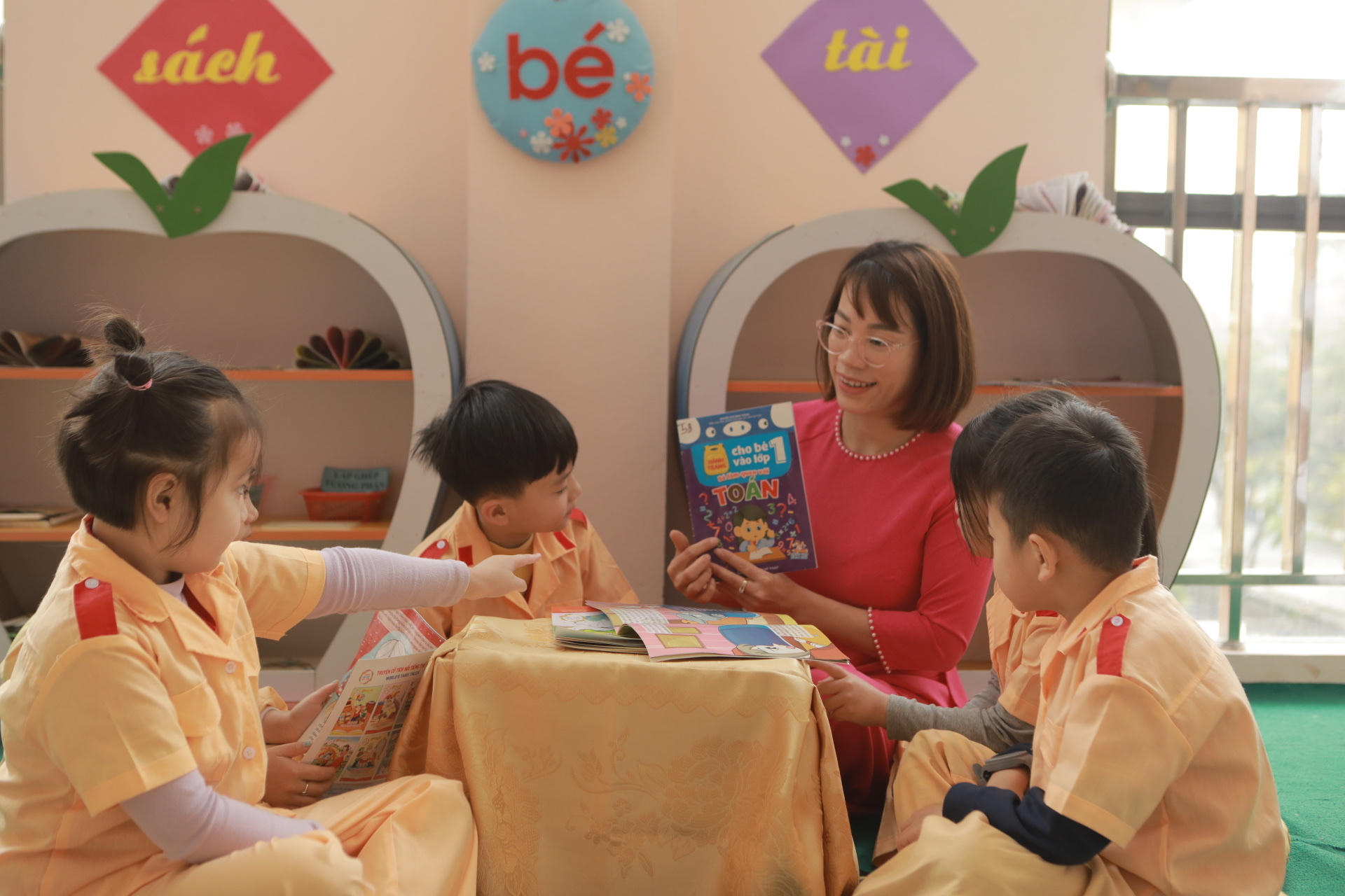 Cô và trò Trường Mầm non 19/5, thành phố Lạng Sơn trong tiết học ATGT tại thư viện trường. |