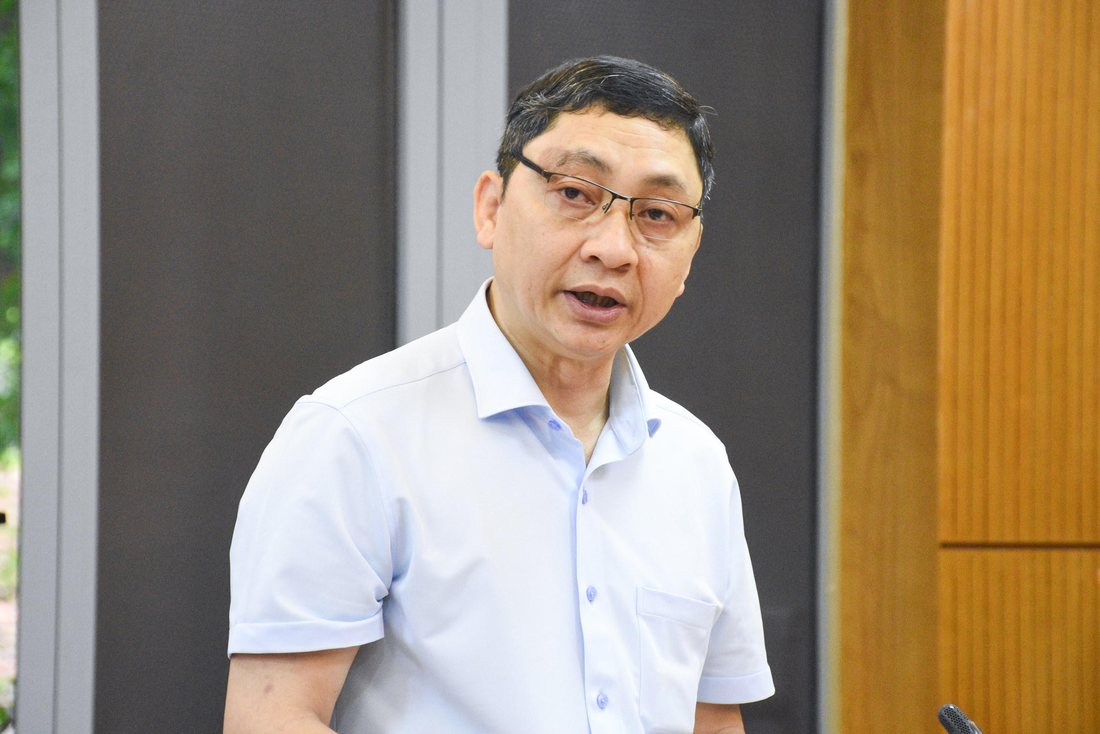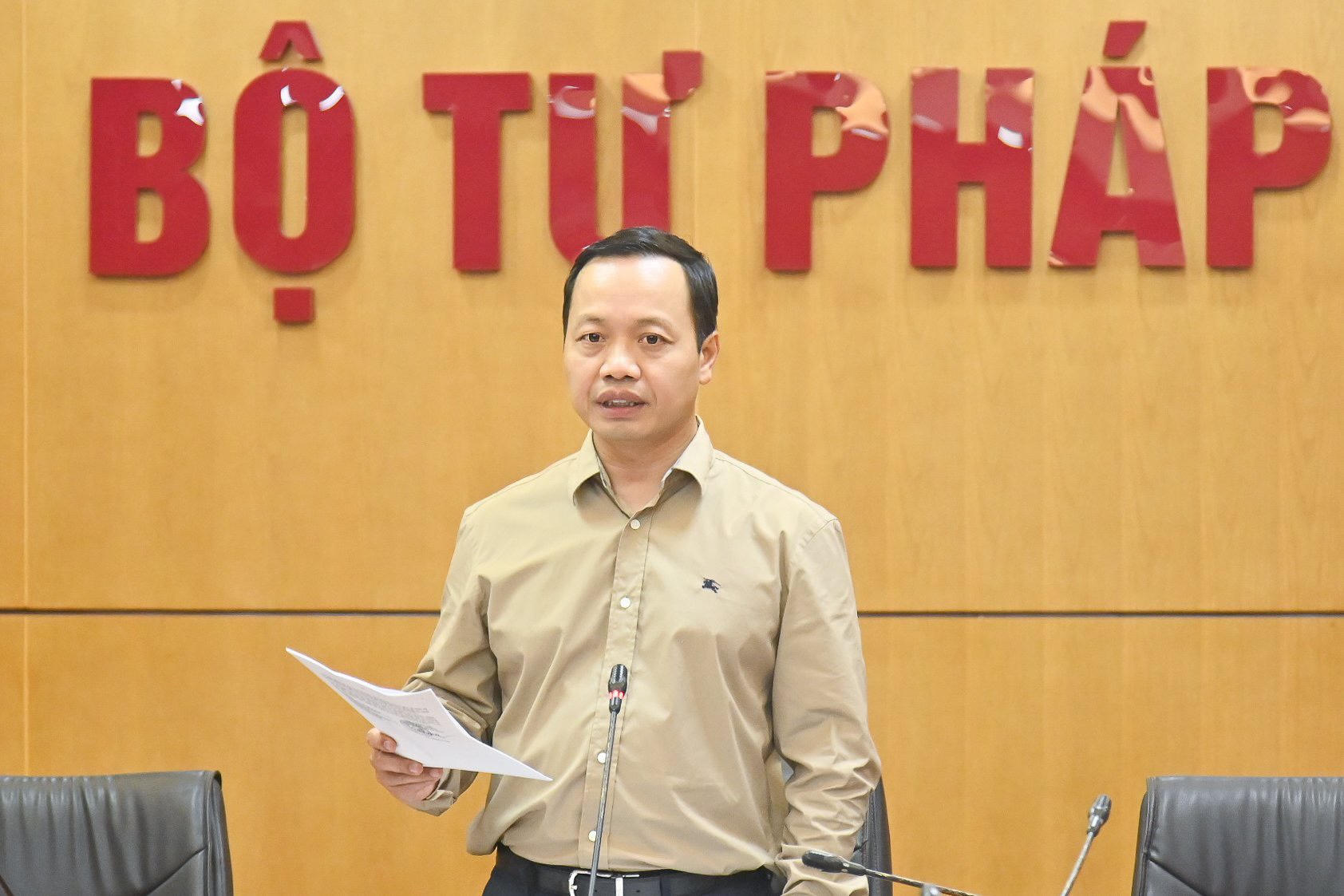 Phó Vụ trưởng phụ trách Vụ Các vấn đề chung về xây dựng pháp luật Trần Anh Đức báo cáo tại cuộc họp. |