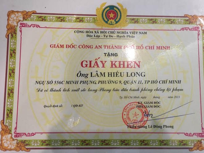 Chỉ 3 năm qua, Lâm Hiếu Long đã nhận được 15 bằng khen của chính quyền các cấp, trong đó có 3 bằng khen của lực lượng công an TP.HCM. Nhưng đối với chàng trai này thì “những tấm bằng khen đó là nguồn động lực, động viên anh em làm việc, chứ mình làm công việc này cũng chỉ là để thỏa đam mê và để không thấy có lỗi với bản thân...”.