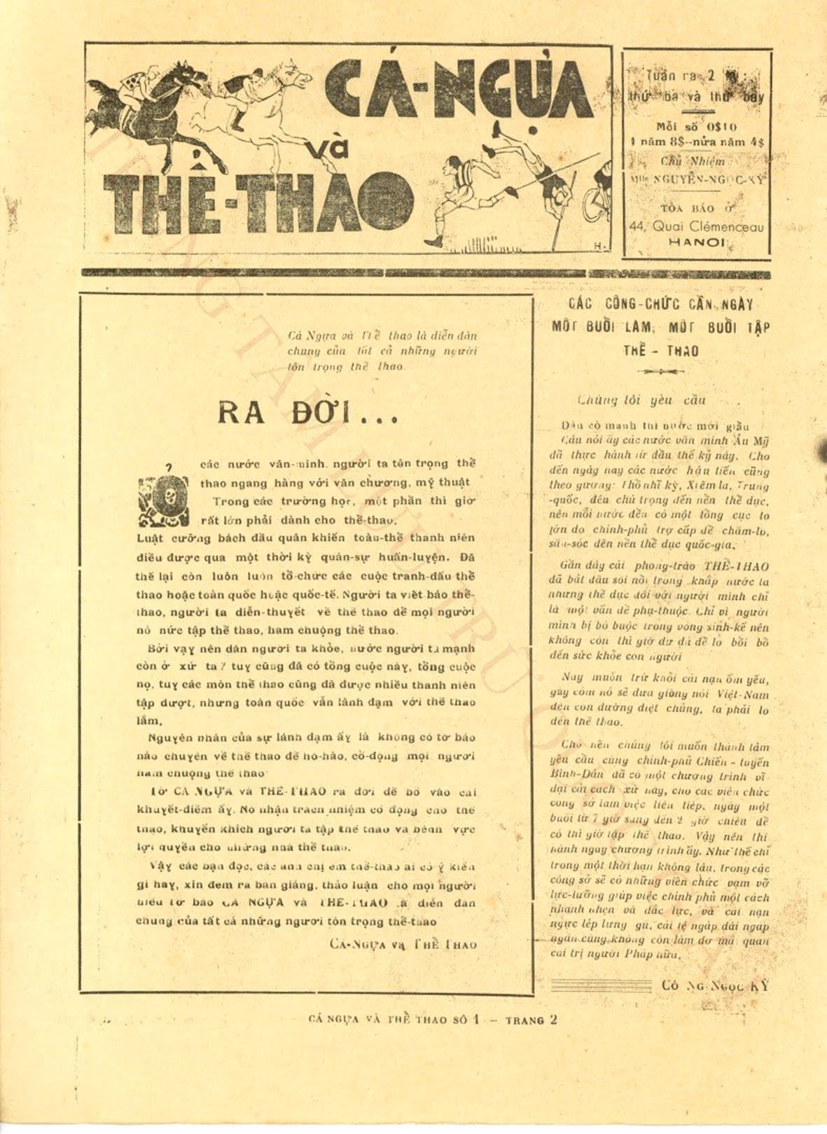 Ở Hà Nội còn có tuần báo Bắc Kỳ Thể Thao phát hành số đầu ngày 04/11/1930 và số cuối ngày 27/6/1933. Báo do ông Nghiêm Xuân Huyến làm chủ nhiệm và thường in ở nhà riêng. Hay bán tuần báo Cá Ngựa và Thể Thao ra đời khoảng những năm 1930 do cô Nguyễn Ngọc Kỳ làm chủ nhiệm. Báo quán đặt tại số 44 Quai Clémenceau (nay là phố Trần Nhật Duật), Hà Nội.