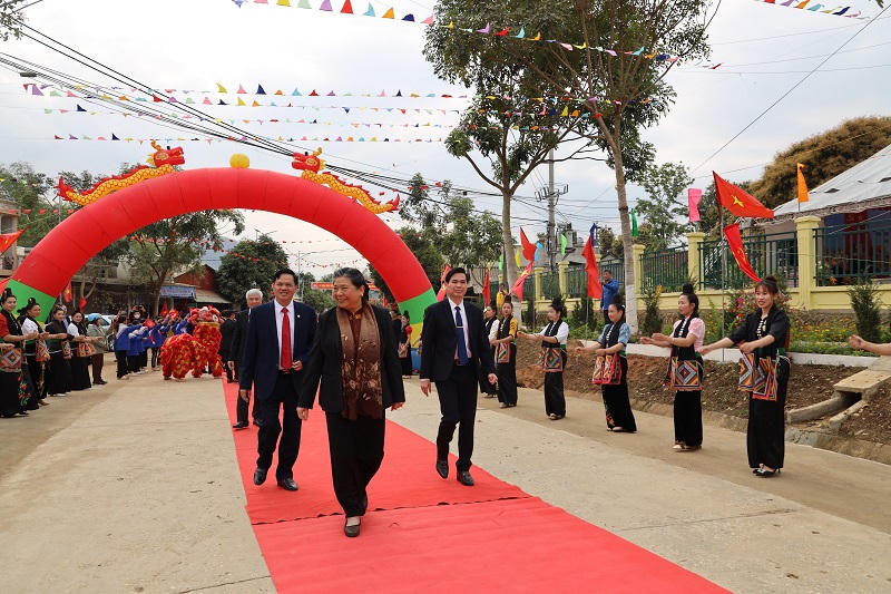 Nguyên Ủy viên Bộ Chính trị, nguyên Phó Chủ tịch Thường trực Quốc hội Tòng Thị Phóng về dự lễ công bố xã Mường Lầm đạt chuẩn NTM. |