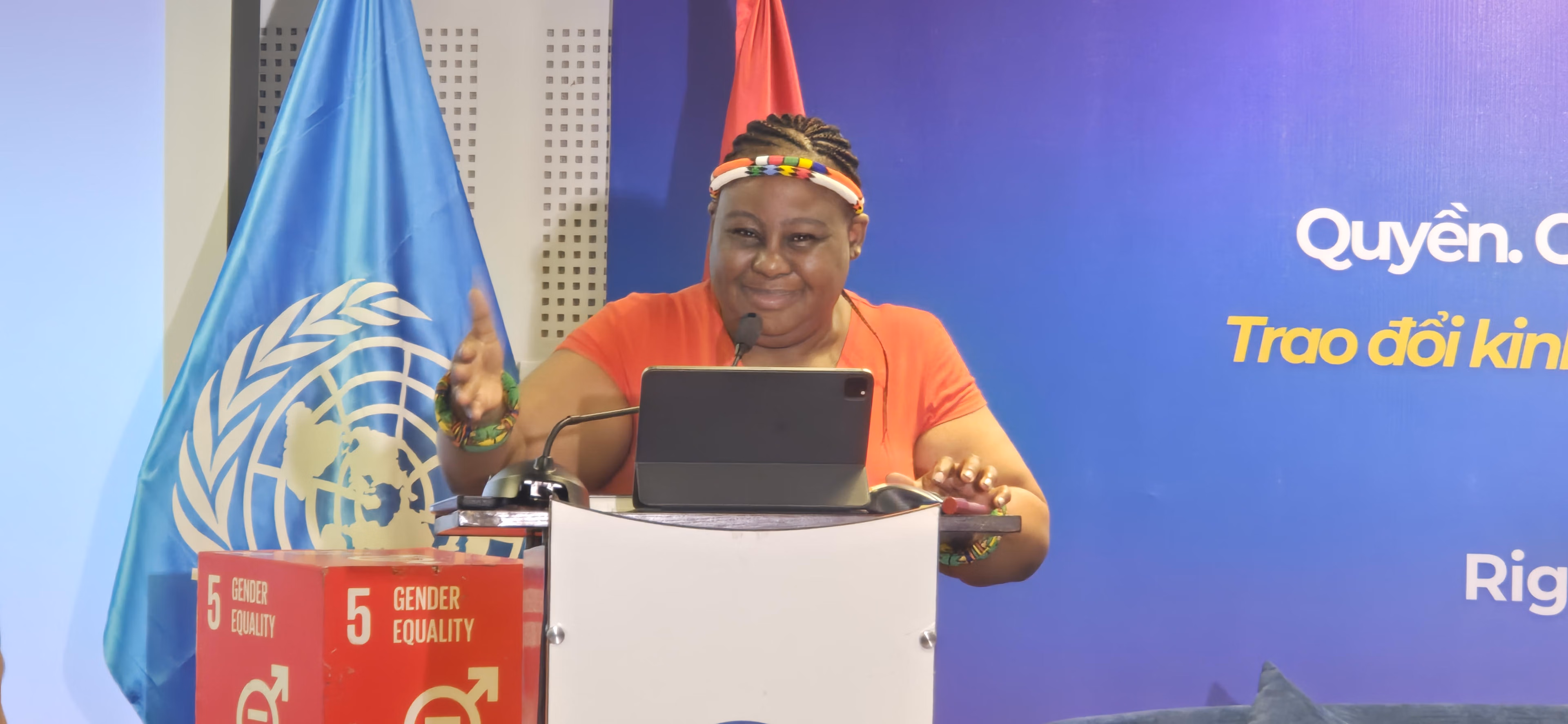 Tại Tọa đàm, bà Nguyễn Thị Minh Hương – Phó chủ tịch Hội Liên hiệp Phụ nữ Việt Nam – đã chia sẻ về những tiến bộ quan trọng nhất của Việt Nam trong việc đảm bảo quyền tiếp cận không lý cho phụ nữ và trẻ em gái, và một số hành động thiết thực để góp phần giải quyết các thách thức và tồn tại ngày nay.