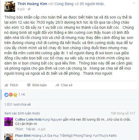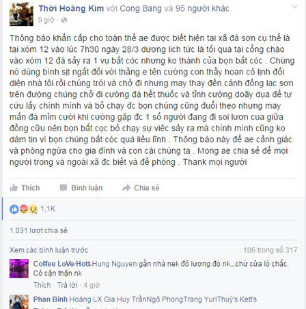 Ngày 29/3 trên fanpage facebook của một người có nickname Thời Hoàng Kim (Hoàng Đen) đăng tải một status "Thông báo khẩn" có nội dung: Thông báo khẩn cấp cho toàn thể anh em được biết hiện tại xã Đà Sơn cụ thể là tại xóm 12 vào lúc 7h30 ngày 28/3 Dương lịch (tức là tối qua) tại cổng chào vào xóm 12 đã xảy ra 1 vụ bắt cóc nhưng không thành của bọn bắt cóc.