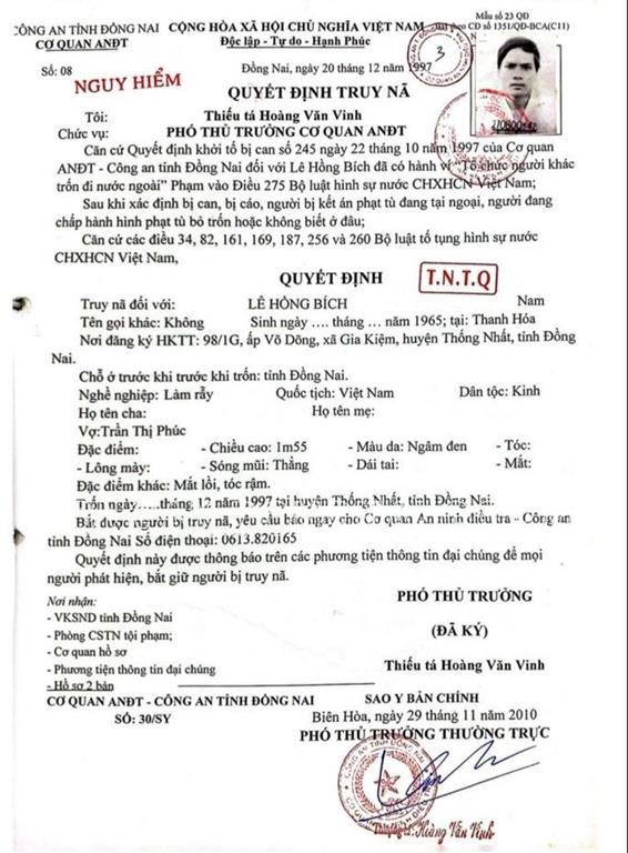 Quyết định truy nã Lê Hồng Bích của Công an tỉnh Đồng Nai |
