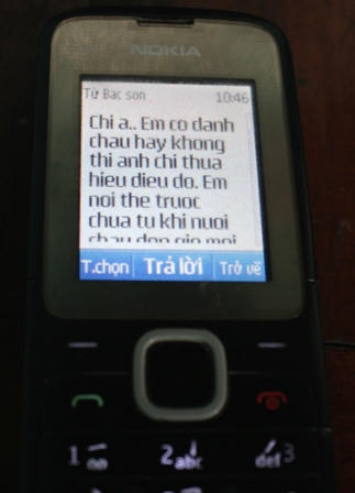 “Em co danh chau hay khong thi anh chi thua hieu, em the truoc chau T tu khi nuoi chau den gio moi tat chau 4 cai. Con anh chi ma nghi em nhu vay thi em buon lam”, tin nhắn Sơn gửi cho chị Giang. “Hien tai em chua co tien, may hom nua em nhan tien tu phuong xa gui ve em se den gap chi va chau. Con anh Sy mai mai khong bao gio em gap. Doi voi T, em se coi nhu con va se nuoi chau het doi nay”. Một tin nhắn Sơn gửi đến cho chị Giang, tin nhắn không dấu.