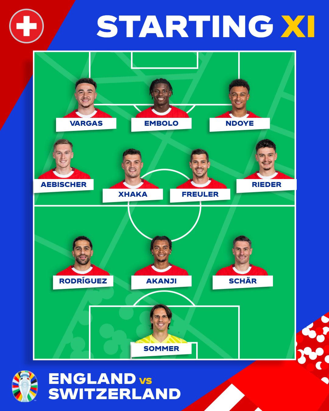 Không có gì ngạc nhiên khi HLV Murat Yakin quyết định giữ nguyên niềm tin vào 11 cầu thủ đã đánh bại Italia ở vòng 1/8. Granit Xhaka, Manuel Akanji và Xherdan Shaqiri đều quen thuộc với nhiều đối thủ của mình.