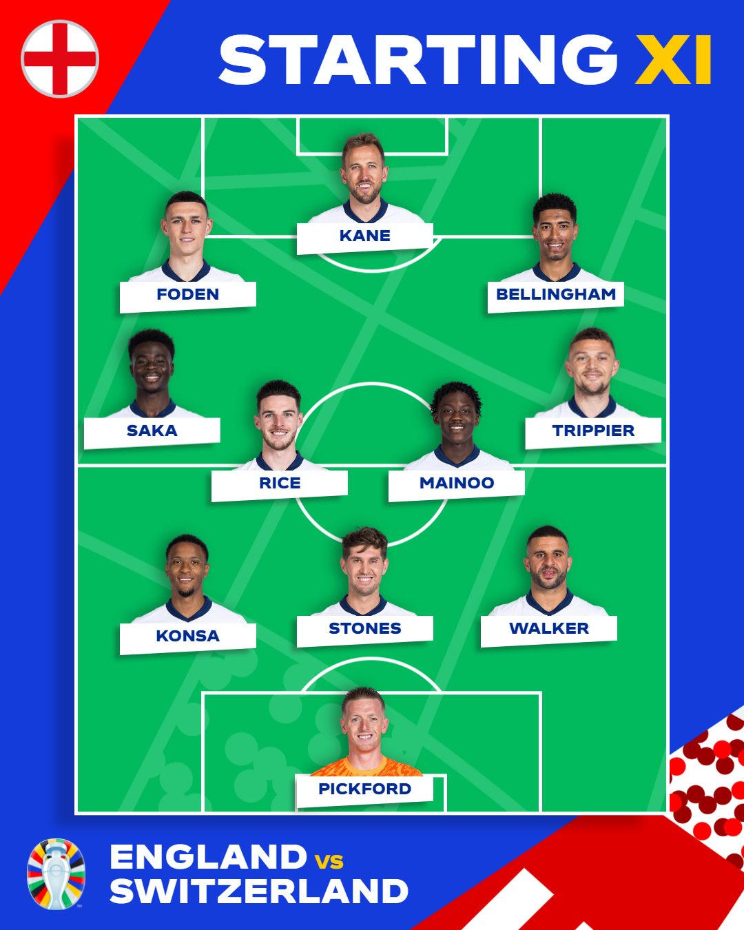 HLV Gareth Southgate vẫn giữ nguyên sơ đồ 4-2-3-1, trong đó chỉ thay duy nhất một vị trí, khi Marc Guehi nhận án treo giò và nhường chỗ cho Ezri Konsa đá cặp trung vệ với John Stones. Hiện tại, ông Southgate đang thành công với đội tuyển Anh dù bị chỉ trích về lối chơi.