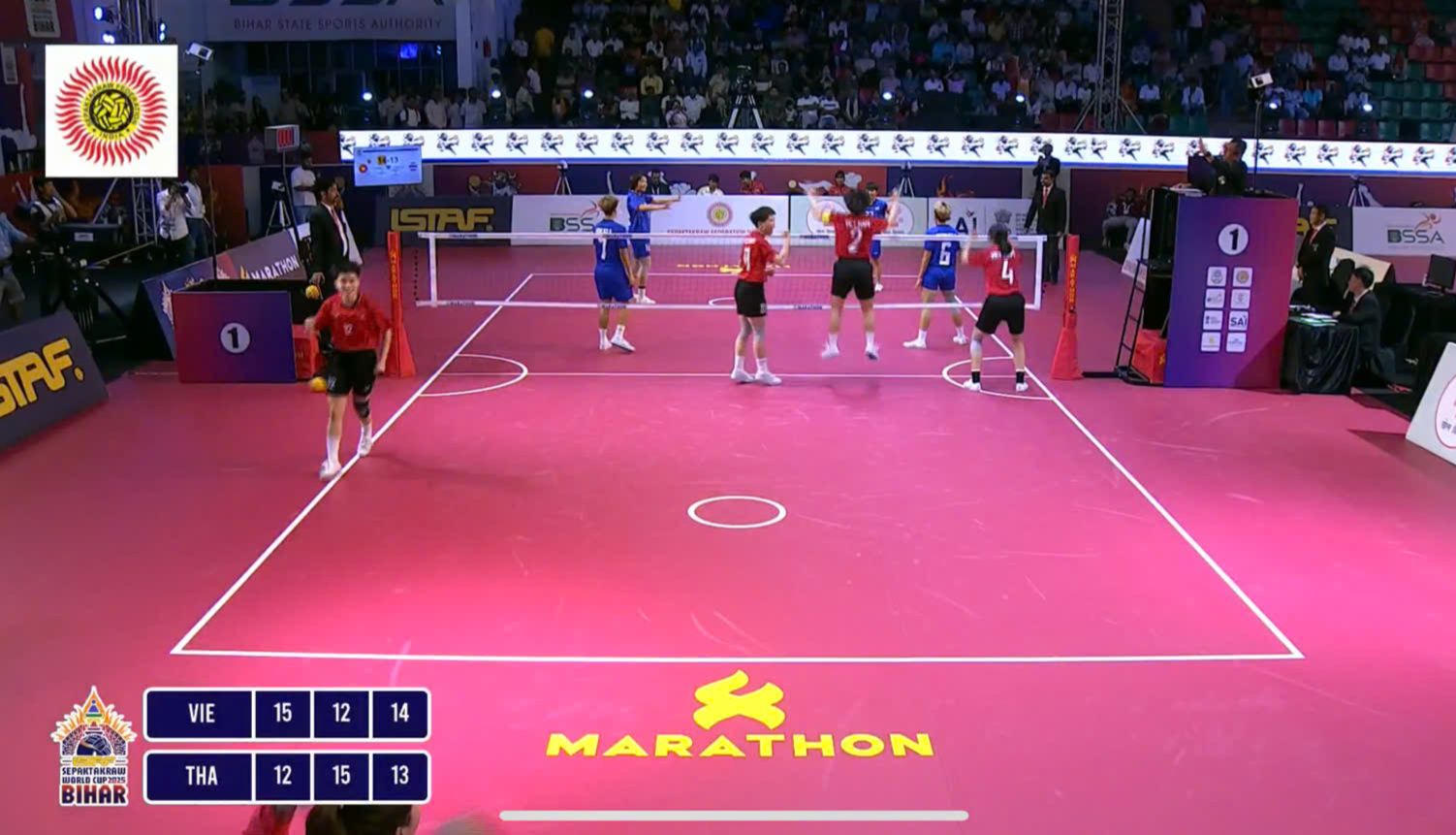 Ở bán kết, Việt Nam đối đầu với đội chủ nhà Ấn Độ trong một trận đấu căng thẳng. Dù bị đối thủ cầm hòa 1-1 sau hai set đầu tiên (15-10, 16-17), các chàng trai Việt Nam vẫn giữ vững tinh thần và giành chiến thắng 15-10 ở set cuối cùng, qua đó giành vé vào chung kết.