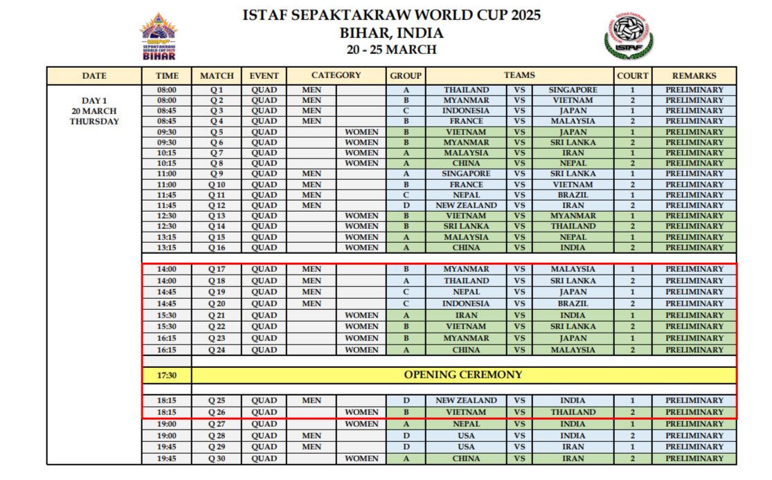 Lịch thi đấu trong ngày 20/3 theo giờ Ấn Độ (Giờ Việt Nam +1h30) |