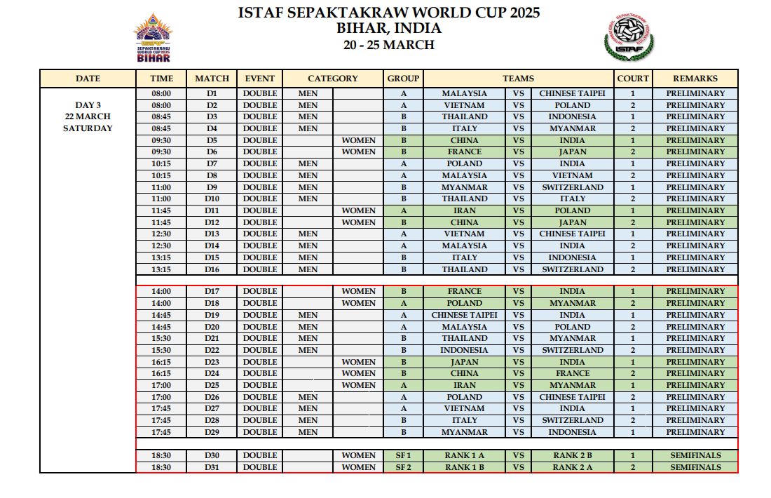 Lịch thi đấu trong ngày 22/3 theo giờ Ấn Độ (Giờ Việt Nam +1h30) |
