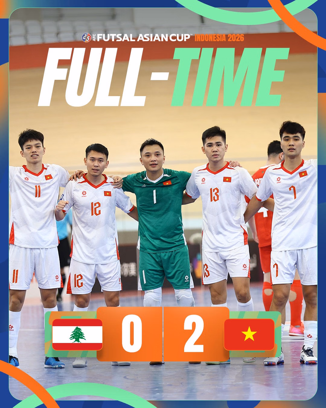 Chung cuộc, đội tuyển futsal Việt Nam giành chiến thắng 2-0 trước Lebanon, qua đó có được 6 điểm sau hai trận toàn thắng tại bảng B Vòng chung kết futsal châu Á 2026, mở rộng cánh cửa tiến vào tứ kết.