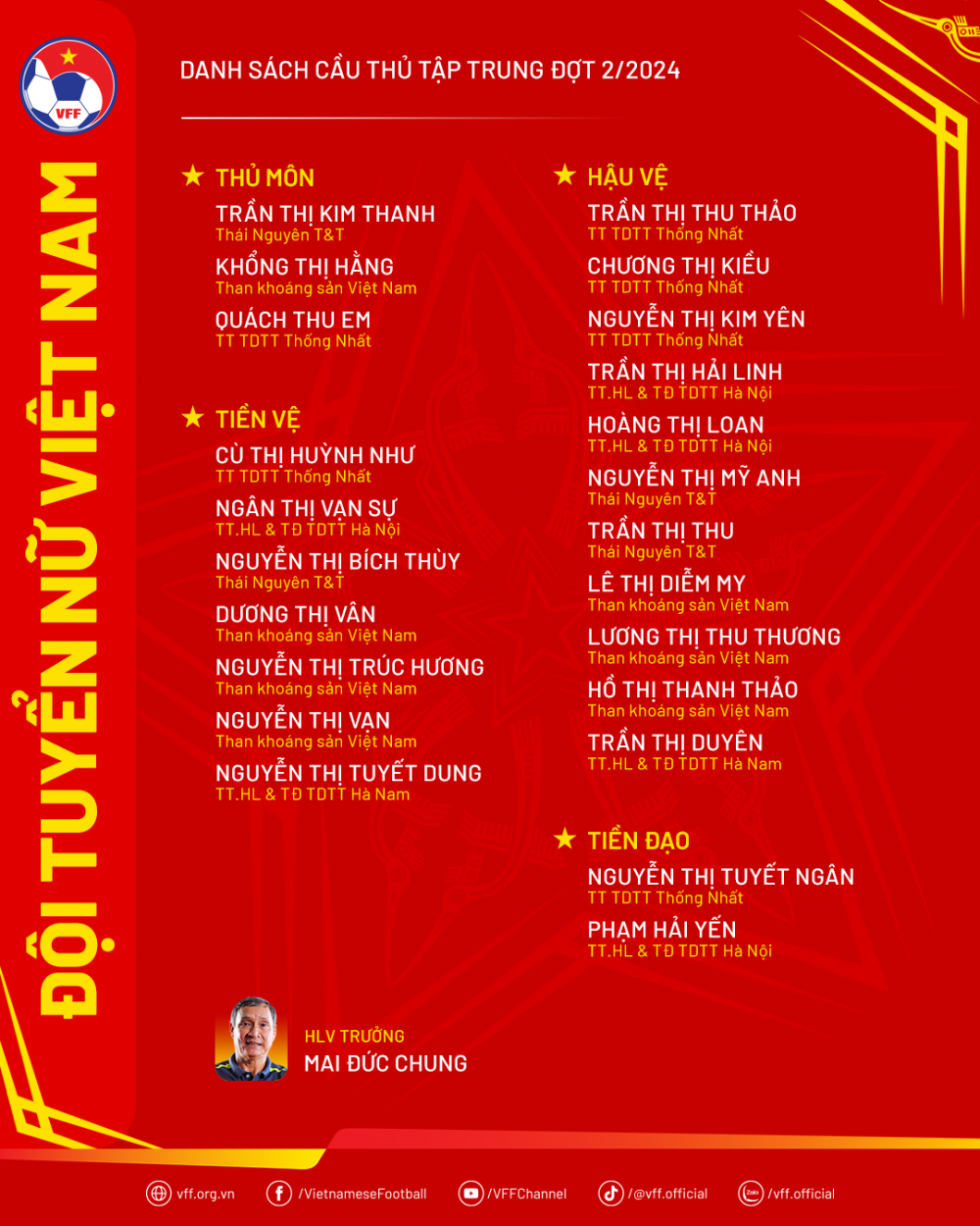 Ở đợt tập trung lần này, chuyên gia thể lực Cedric Roger sẽ trở lại nhiệm vụ hỗ trợ HLV Mai Đức Chung, cùng với các trợ lý Đoàn Minh Hải, Đoàn Thị Kim Chi, Nguyễn Thị Kim Hồng và Nguyễn Thị Ngọc Anh.