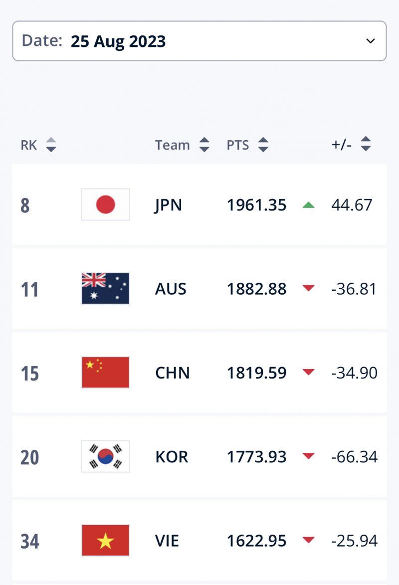 Theo BXH quý III/2023, bóng đá nữ Việt Nam đang nằm trong tốp 5 châu Á sau Nhật Bản, Úc, Trung Quốc và Hàn Quốc. Trên BXH thế giới, bóng đá nữ Việt Nam xếp vị trí thứ 34 với 1622,95 điểm, không có nhiều thay đổi so với bảng xếp hạng quý II.
