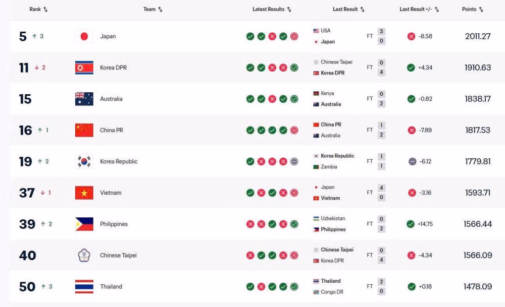 Tại châu Á, đội tuyển nữ Việt Nam đứng thứ 6, sau các đội Nhật Bản (hạng 5), CHDCND Triều Tiên (11), Australia (15), Trung Quốc (16) và Hàn Quốc (19), đồng thời xếp trên Philippines (39), Đài Bắc Trung Hoa (40) và Thái Lan (50).