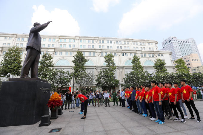 Quang Hải - cầu thủ sở hữu hai bàn thắng đẹp nhất giải vô địch U23 Châu Á và đồng đội nghiêm trang trước tượng đài Bác Hồ.