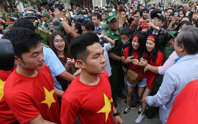 Trưa 4/2, xe chở đội tuyển U23 Việt Nam có mặt tại khu vực tượng đài Bác Hồ (phố đi bộ Nguyễn Huệ, quận 1). Trước khi xuống xe, các cầu thủ liên tục vẫy tay chào người hâm mộ đang đội nắng đứng chờ.