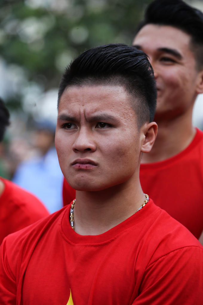 Xe dừng trước trụ sở UBND TP HCM. Xuân Trường, Công Phượng, Tiến Dũng, Quang Hải... lần lượt bước xuống, tươi cười trước sự hò reo của hàng trăm cổ động viên.