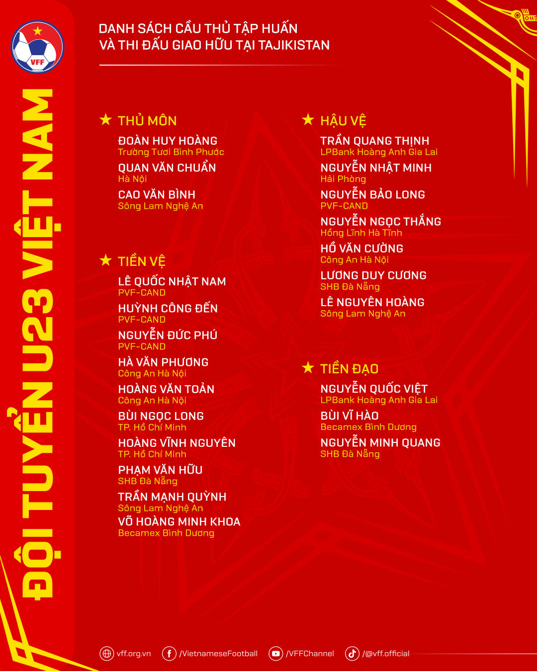 Sau khi ổn định nơi đóng quân tại Dushanbe, chiều nay đội sẽ bước vào buổi tập đầu tiên. Do HLV trưởng Philippe Troussier đang thực hiện nhiệm vụ dẫn dắt đội tuyển Việt Nam thi đấu hai trận gặp Indonesia tại Vòng loại World Cup 2026 (lượt đi ngày 21/3 trên sân Gelora Bung Karno, lượt về ngày 26/3 trên sân Mỹ Đình), nên Trợ lý HLV Moulay Lahsen được giao quyền phụ trách đội tuyển U23 Việt Nam trong thời gian tập huấn và thi đấu tại Tajikistan.